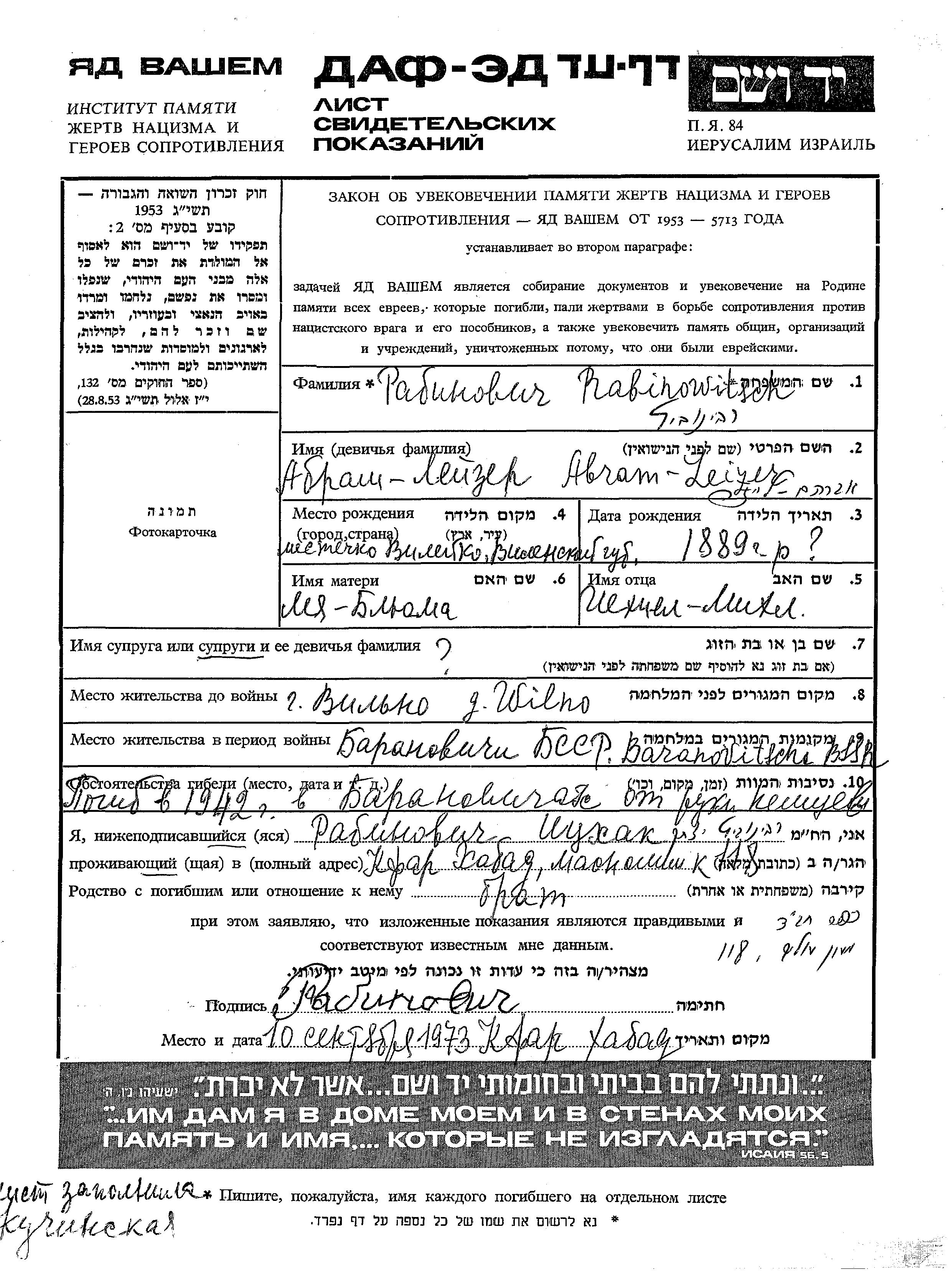 Rabinowitsch Abram Leizer 1889 Wilno, Pologne Feuille de témoignage