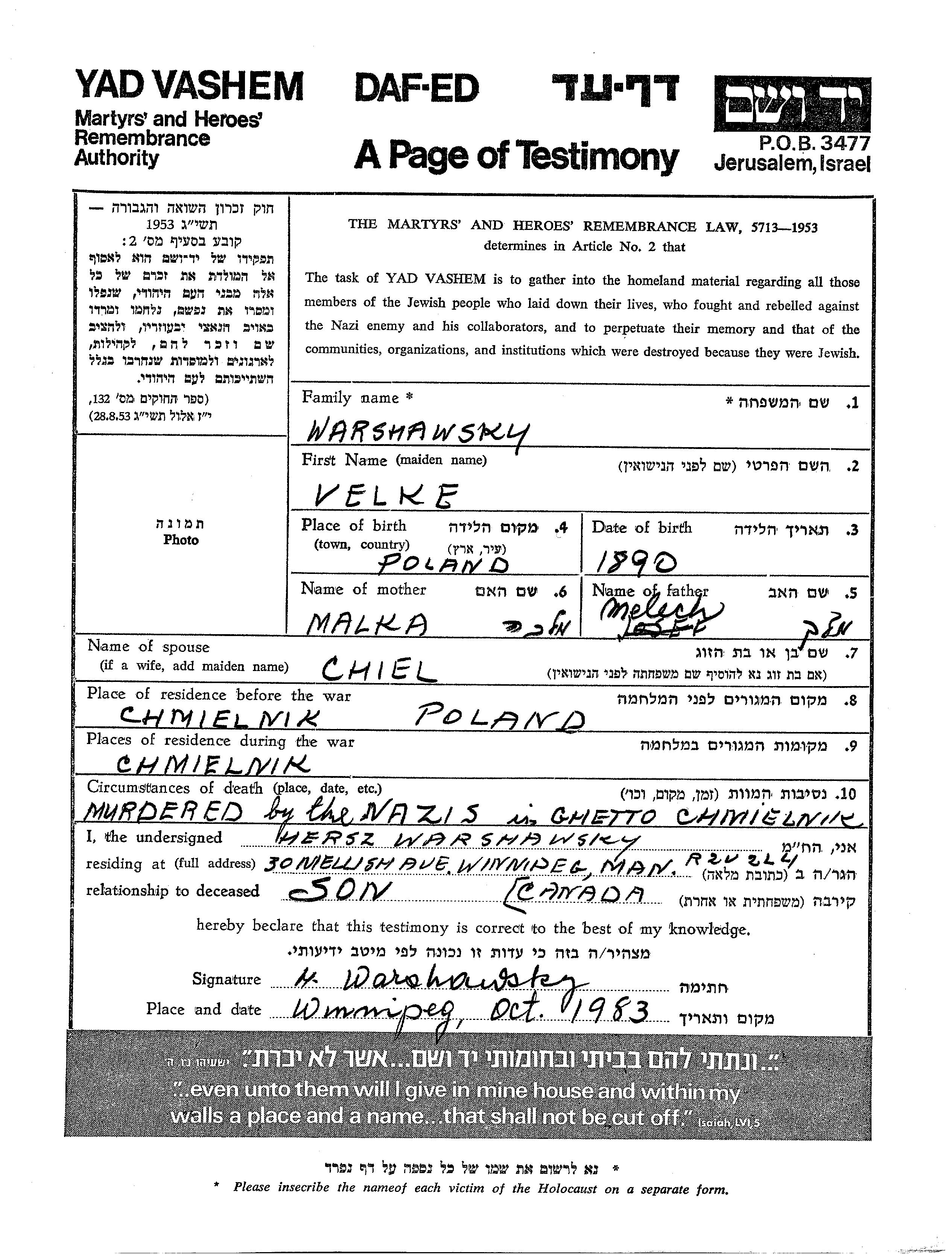 Velke Warshawsky est né à Pologne en 1890, fils de Melech et de Malka. Il était Mariée à Chiel. Avant la seconde guerre mondiale il vivait à Chmielnik, Pologne. Au cours de la guerre, il était à Chmielnik, Pologne.