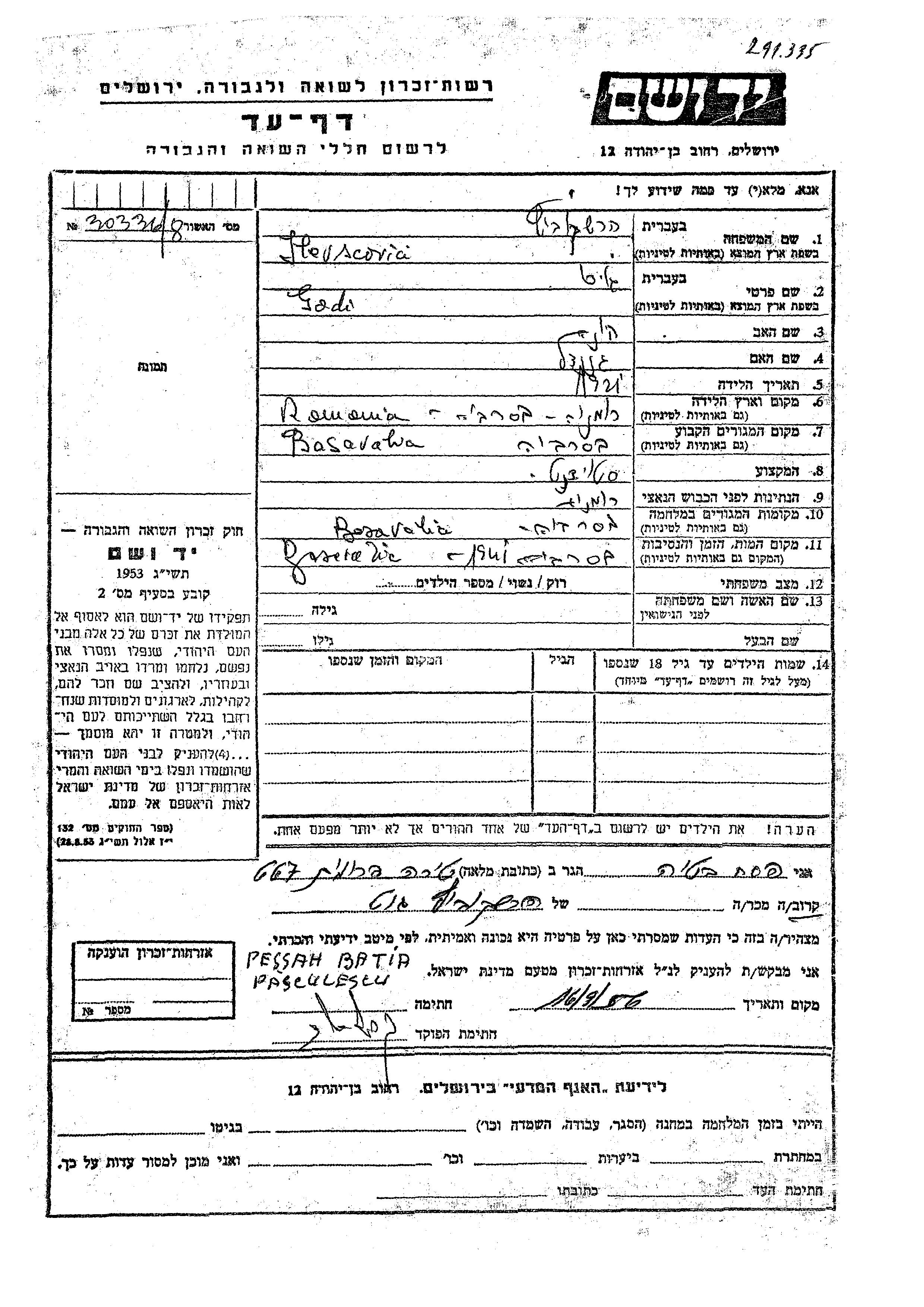 Herscovic Godi 1921 Roumanie Feuille de témoignage