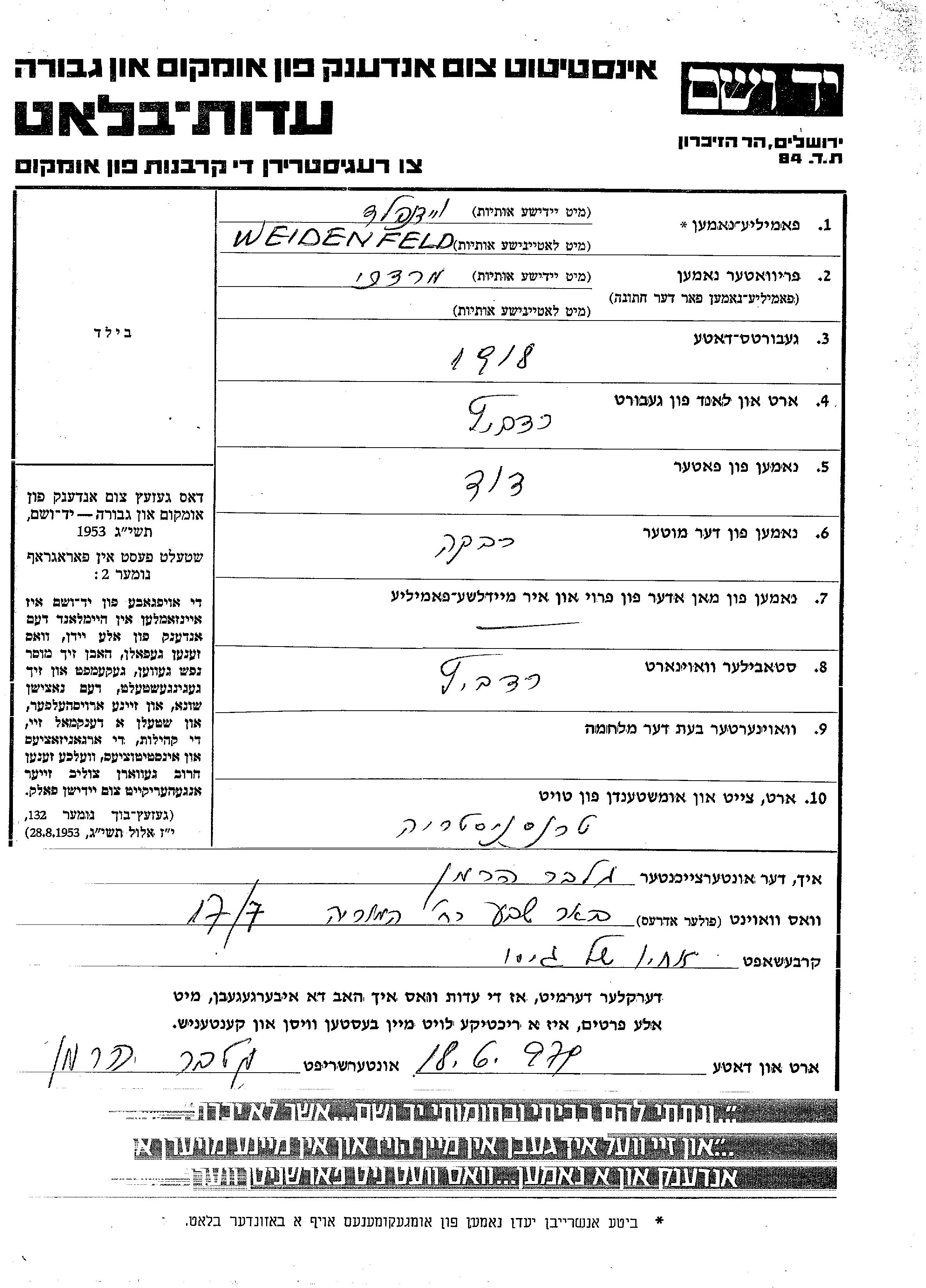 Weidenfeld Mordekhai 1918 Radevitz, Roumanie Feuille de témoignage