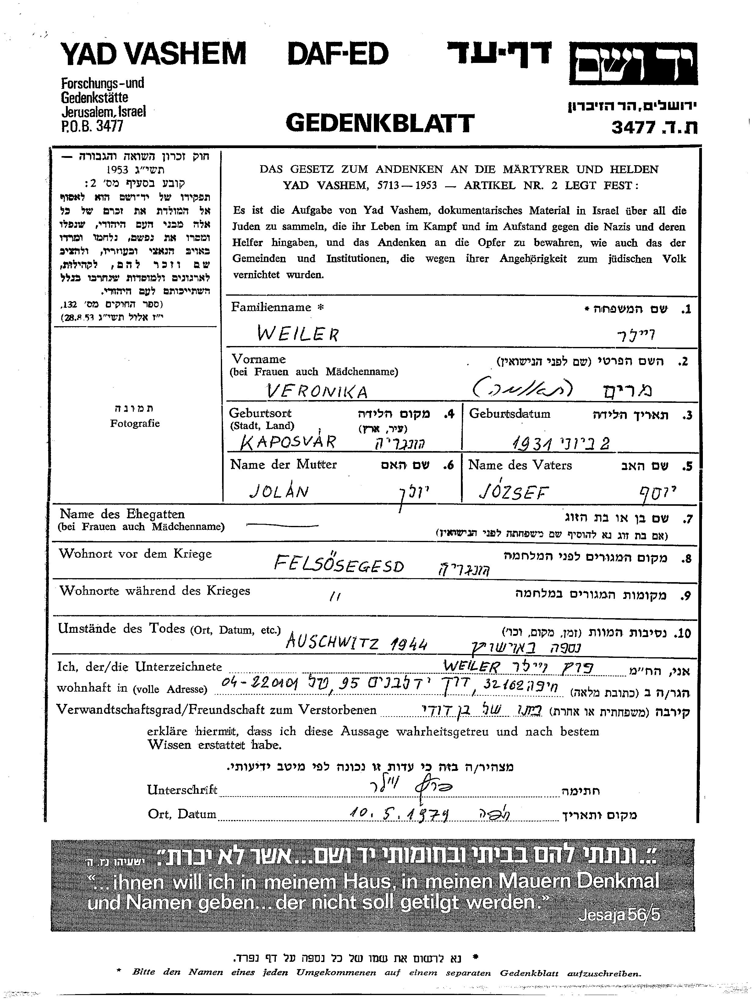 Weiler Veronika Miriam 1931 Felsosegesd, Hongrie Feuille de témoignage