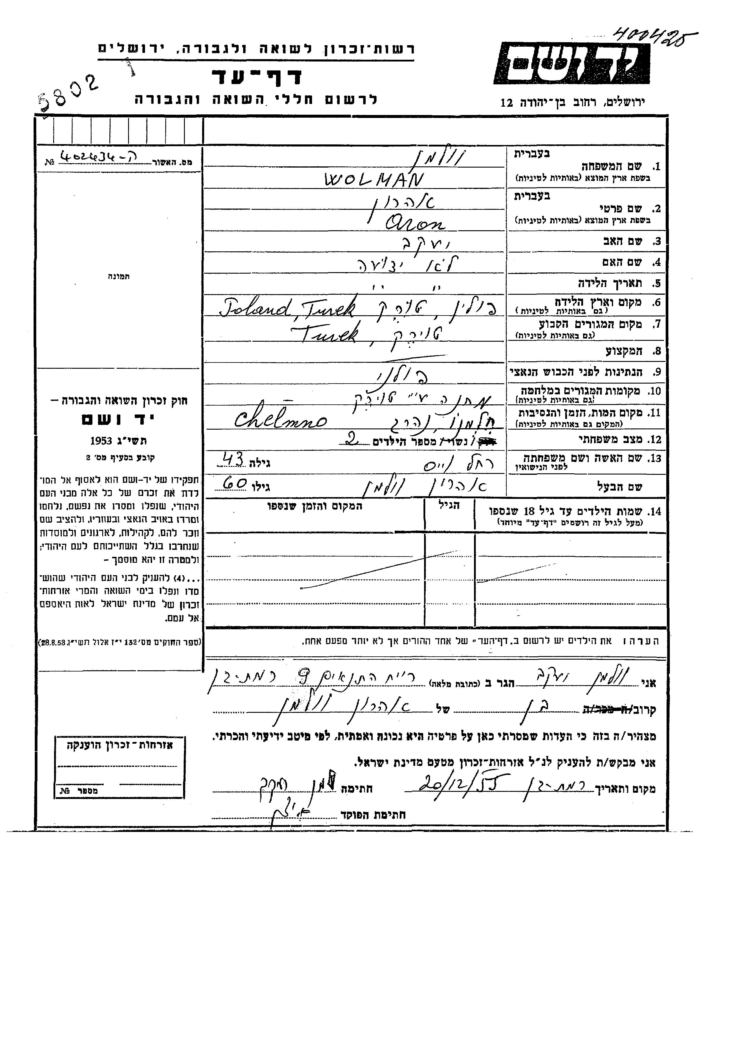 Wolman Aron Turek, Pologne Feuille de témoignage