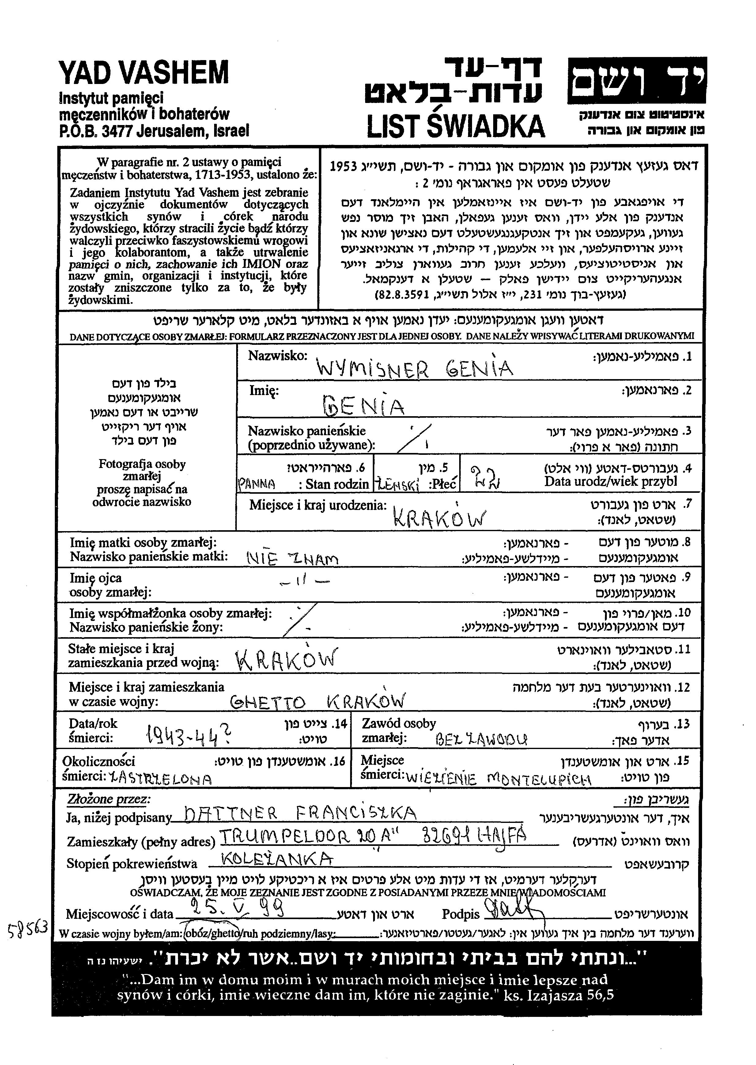 Wymisner Genia Krakow, Pologne Feuille de témoignage