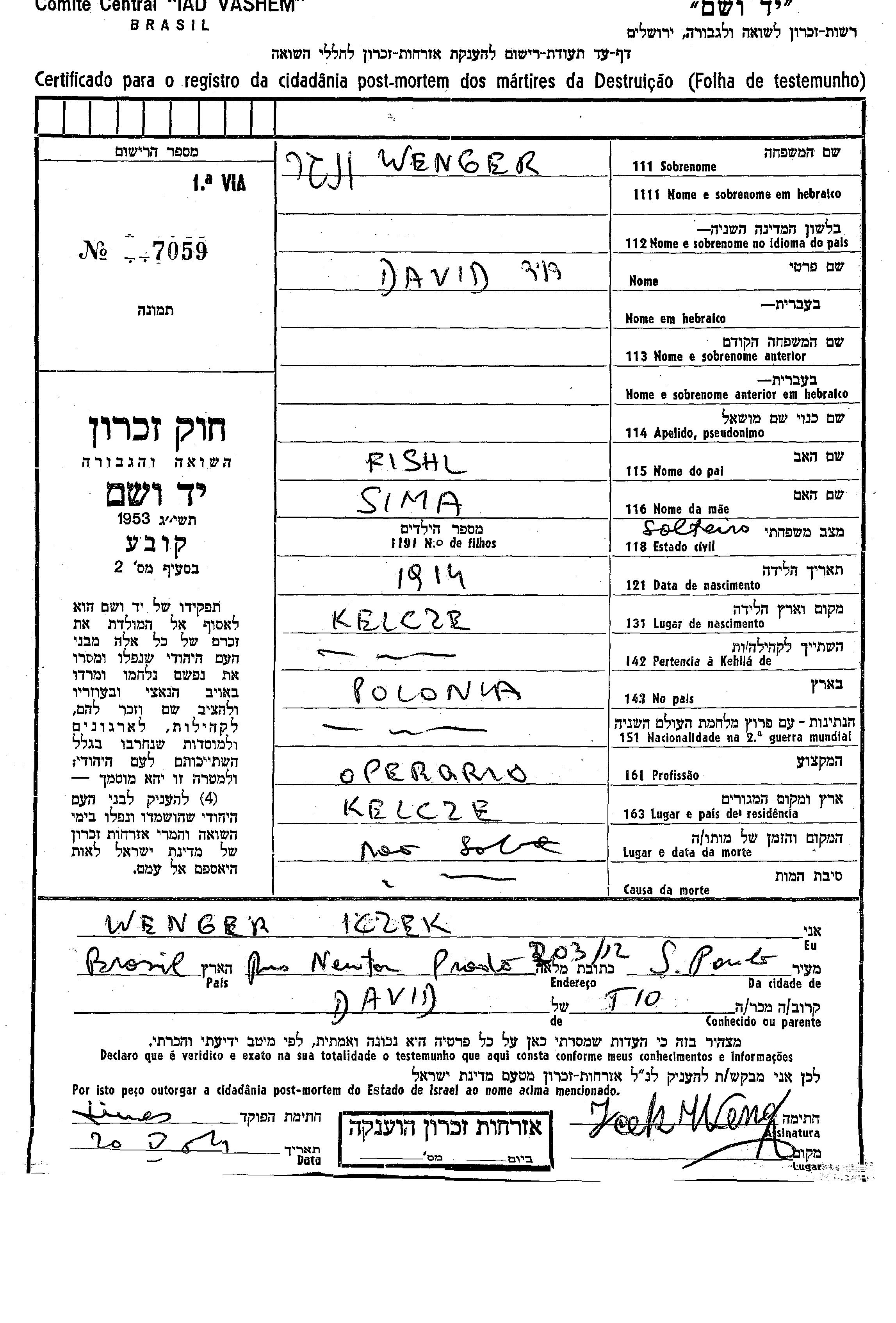 David Wenger est né à Kelce, Pologne en 1914, fils de Fishl et de Sima. Il était Operana et Célibataire. Avant la seconde guerre mondiale il vivait à Kelce, Pologne. Au cours de la guerre, il était à Pologne.