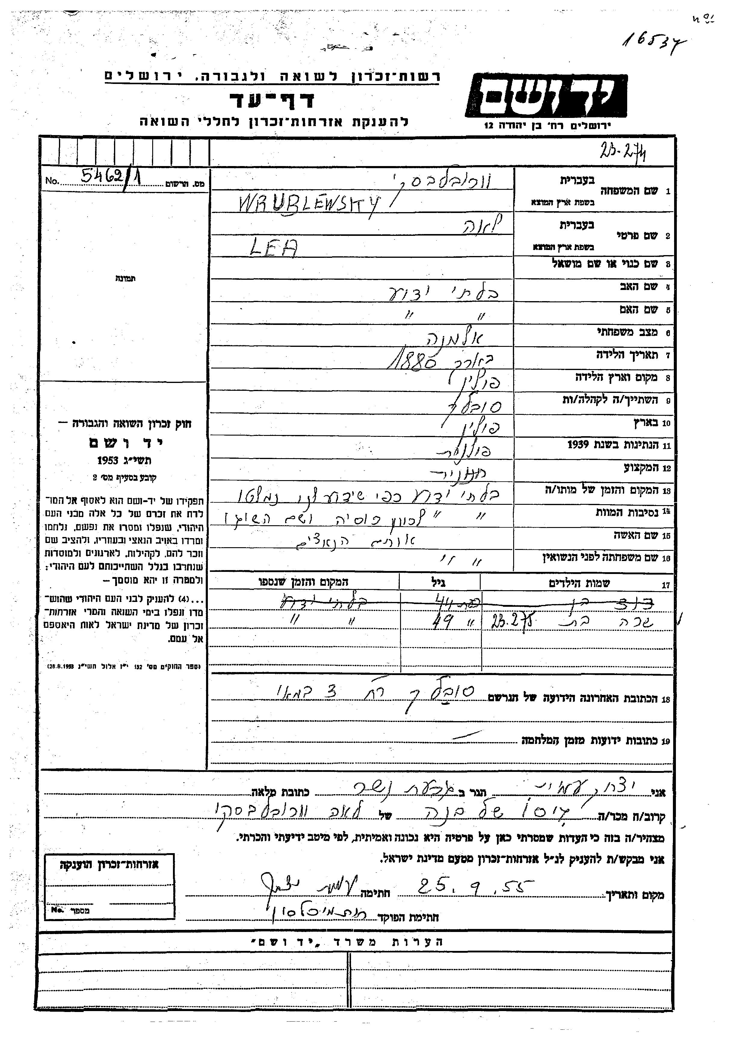 Lea Wrublewsky est née à Pologne en 1880. Elle était Épicier/e et veuve. Avant la seconde guerre mondiale elle vivait à Suwalki, Pologne. Pendant la guerre, elle était à Suwalki, Pologne.