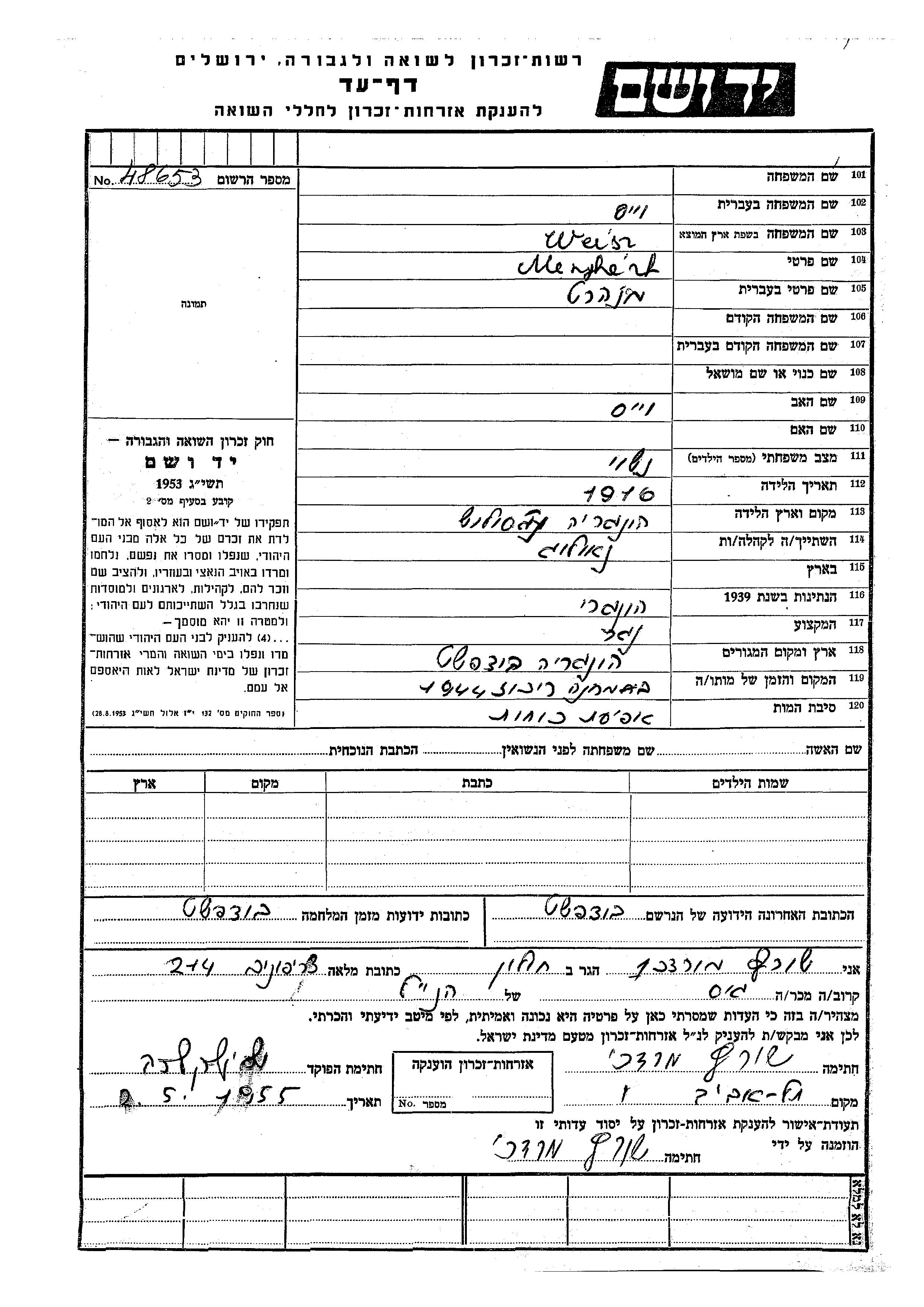 Menhart Weiss est né à Hongrie en 1916. Il était Charpentier. Avant la seconde guerre mondiale il vivait à Hongrie. Au cours de la guerre, il était à Budafok, Hongrie.