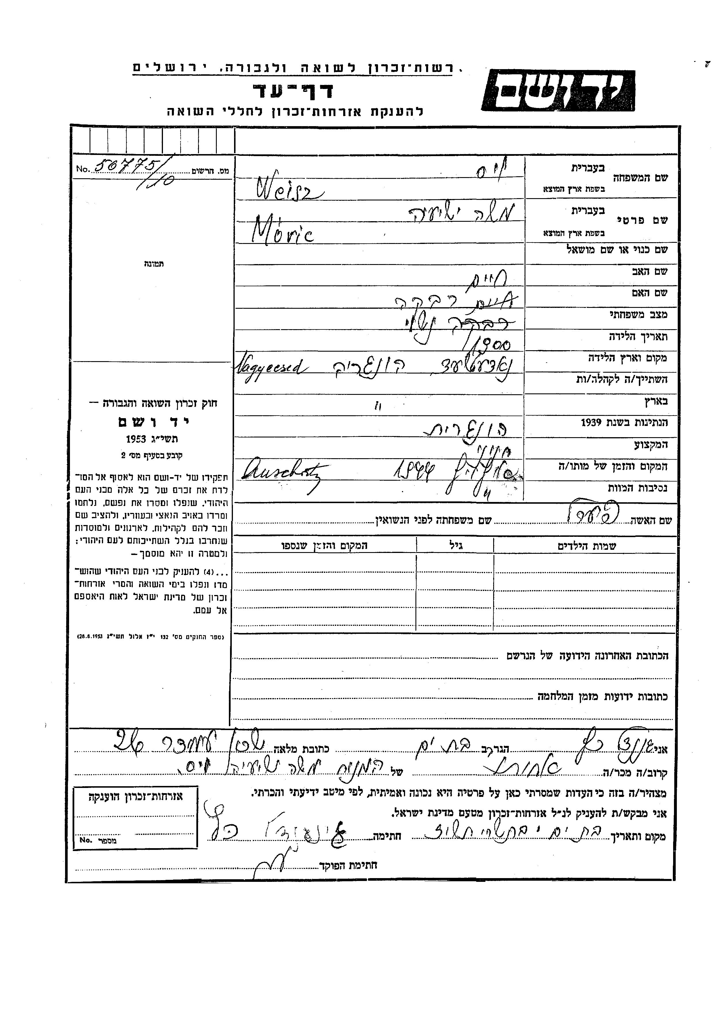 Weisz Moric Moshe Yeshayahu 1900 Nagyecsed, Hongrie Feuille de témoignage
