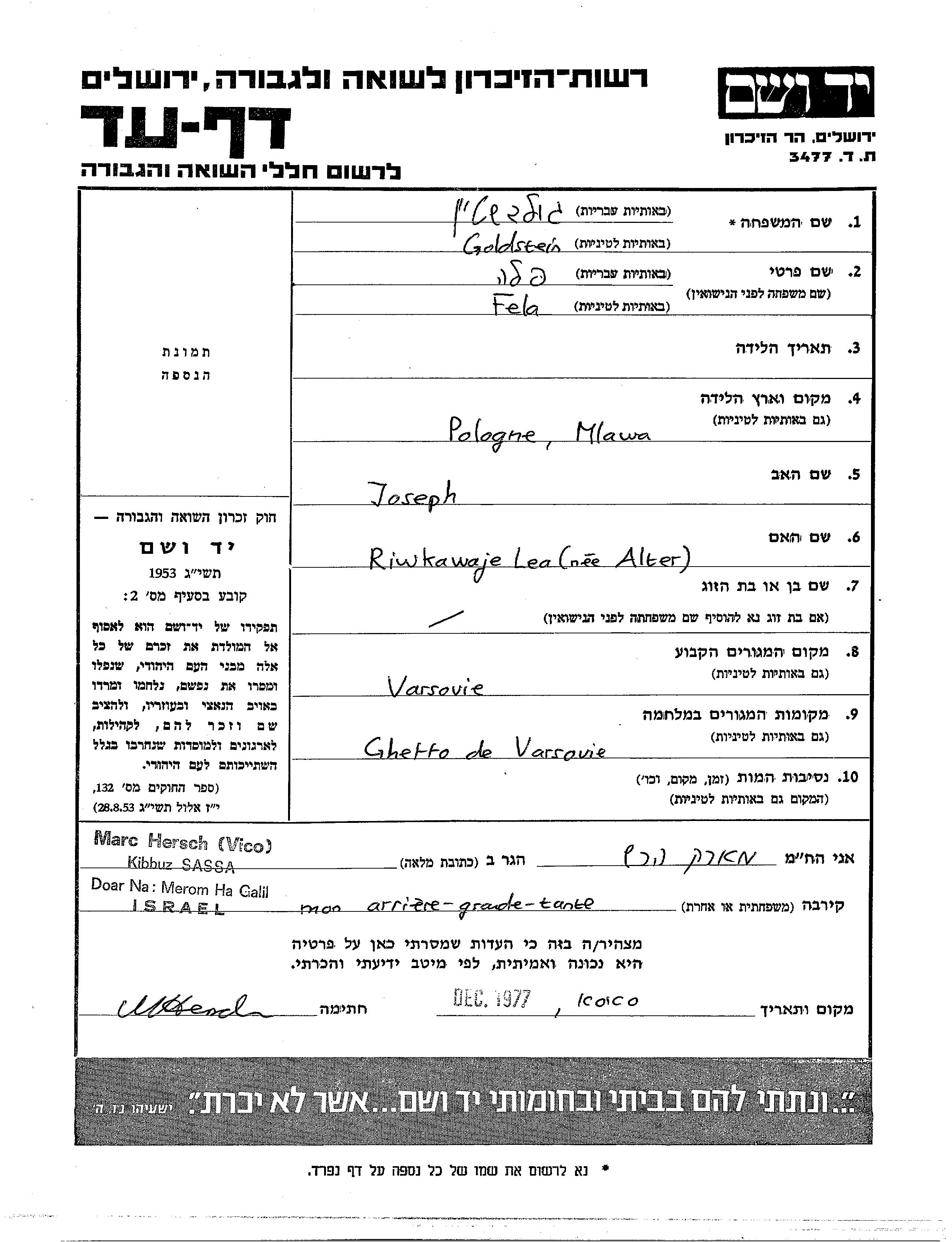 Goldstein Fela Warszawa, Pologne Feuille de témoignage