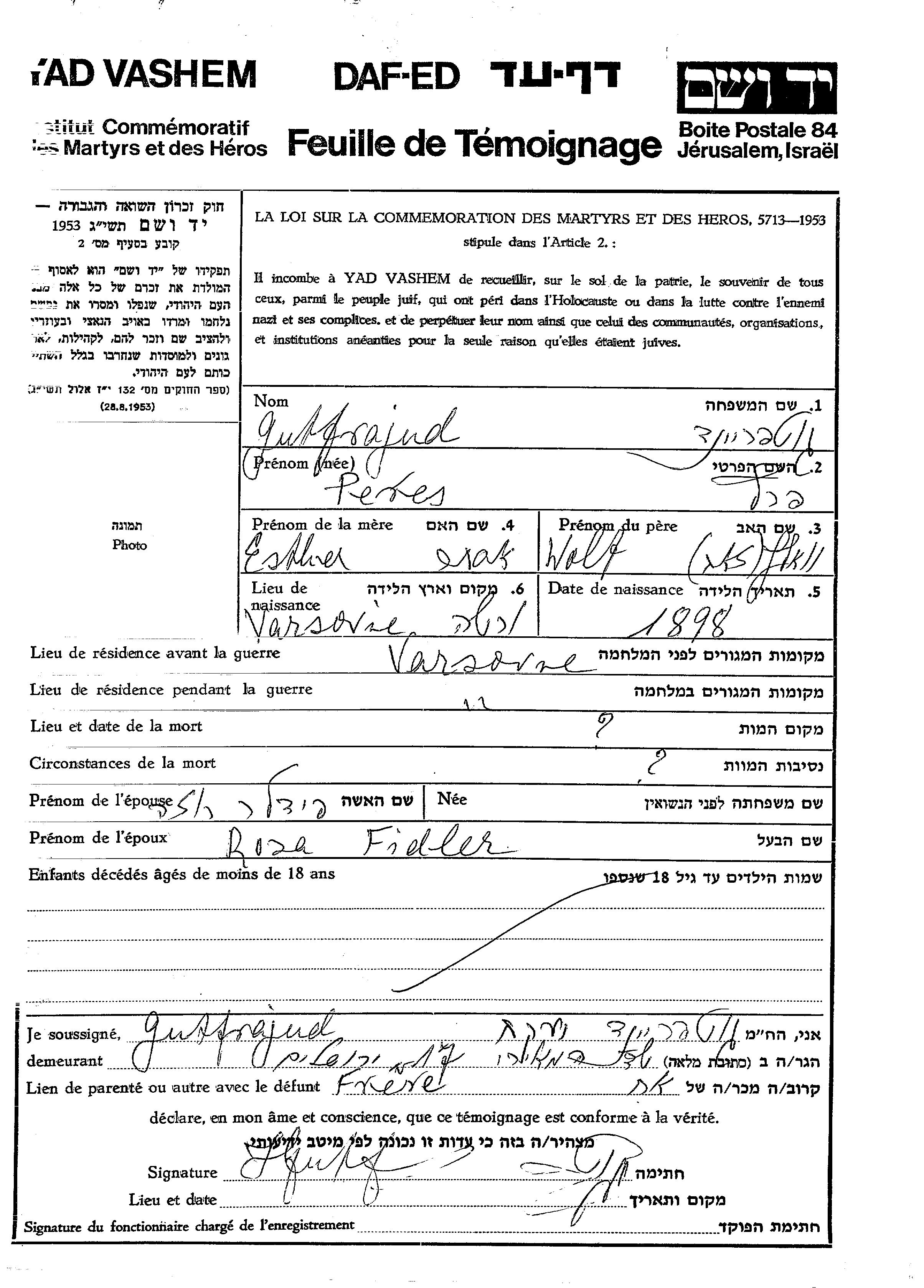 Peres Gutfrajnd est né à Warsaw, Pologne en 1898, fils de Wolf Zeev et de Esther. Il était Mariée à Roza née Fidler. Avant la seconde guerre mondiale il vivait à Warsaw, Pologne. Au cours de la guerre, il était à Warsaw, Pologne.