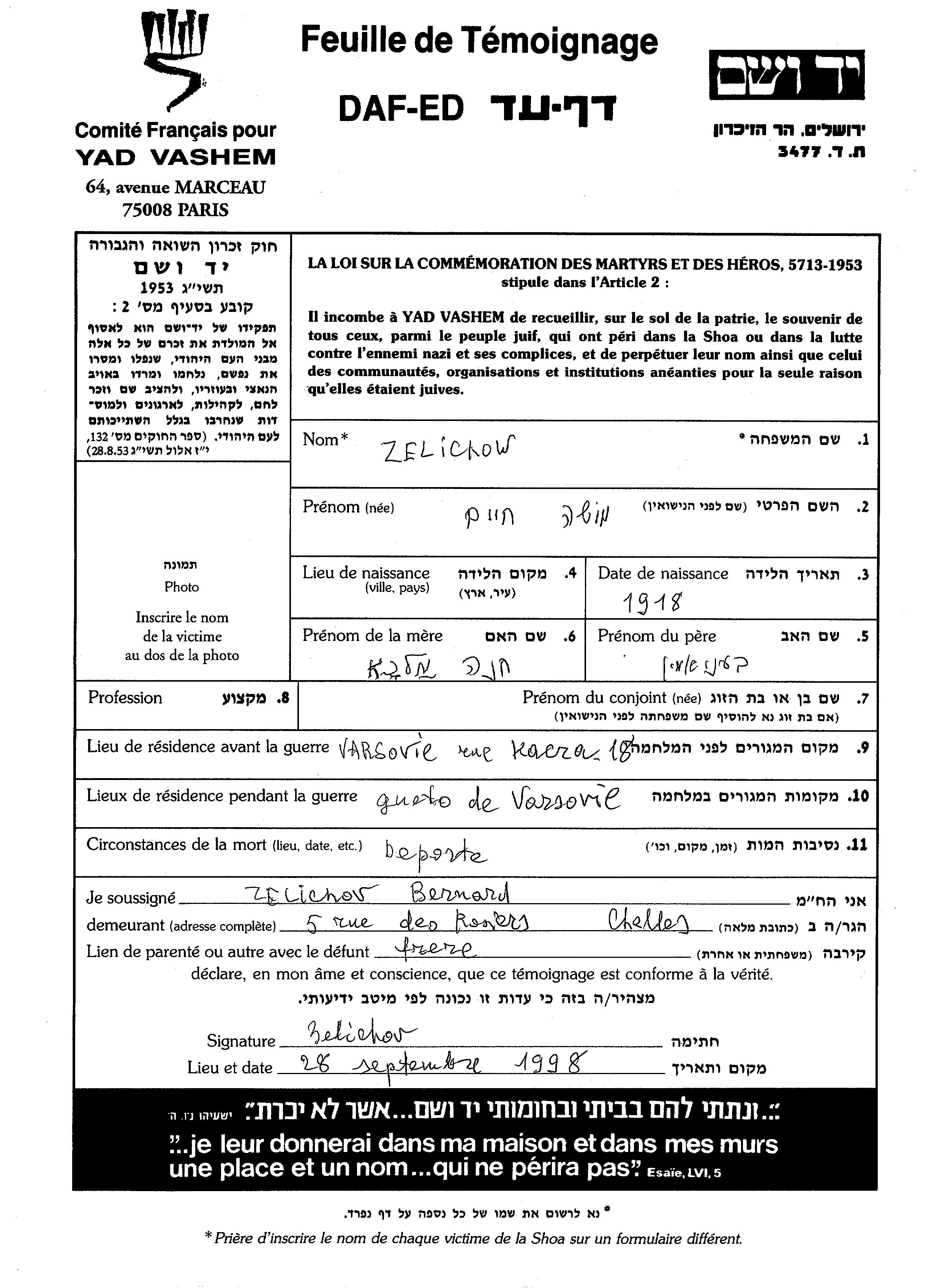 Zelichow Moshe Khaim 1918 Varsovia, Pologne Feuille de témoignage
