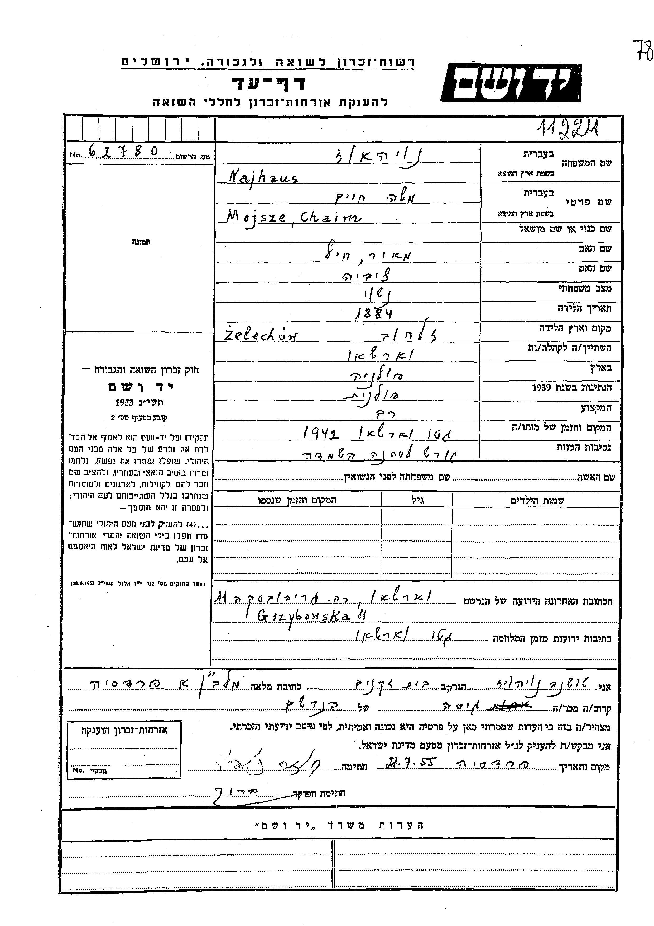 Najhaus Mojsze Chaim 1884 Warszawa, Pologne Feuille de témoignage