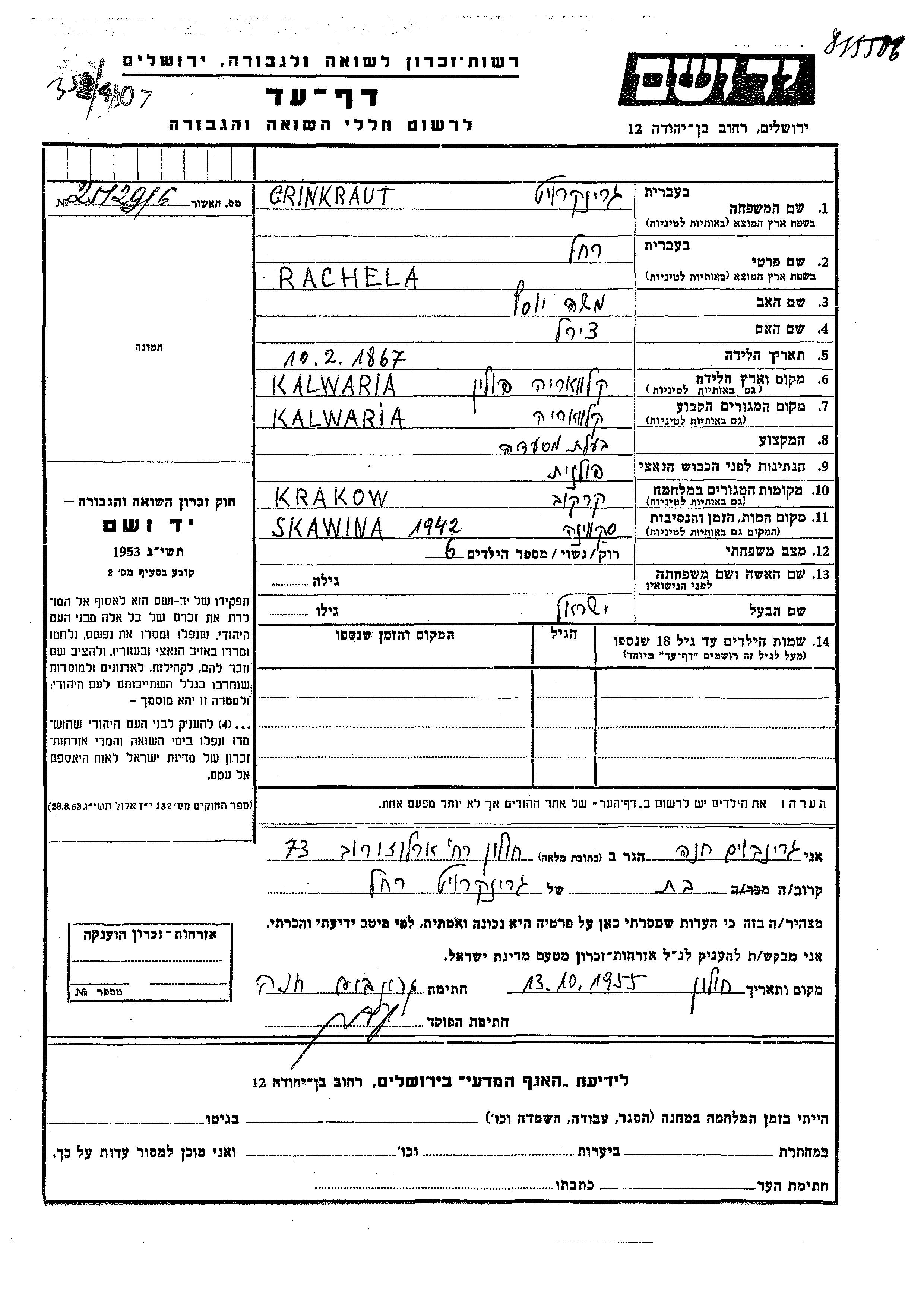 Rachela Grinkraut est née à Kalwaria, Pologne en 1867, fille de Nesha Yosef et de Tzirel. Elle était Restaurateur et Mariée à Yisrael. Avant la seconde guerre mondiale elle vivait à Kalwaria, Pologne. Pendant la guerre, elle était à Krakow, Pologne.