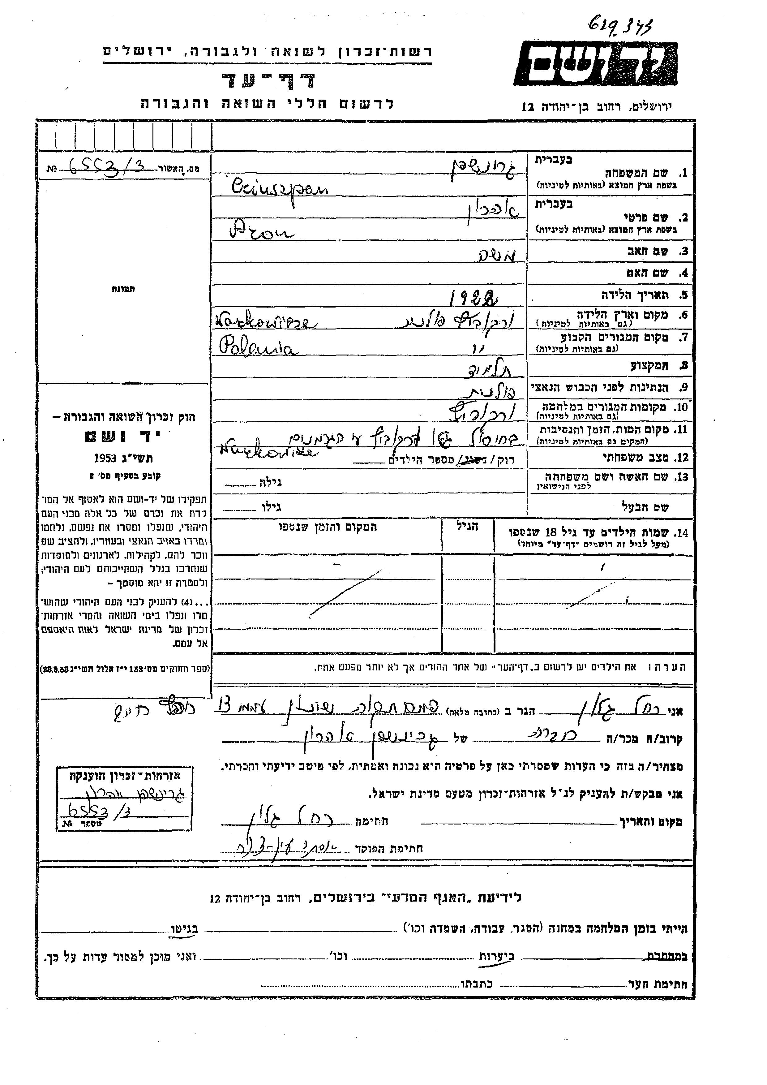 Grinszpan Aron 1922 Warkowicze, Pologne Feuille de témoignage