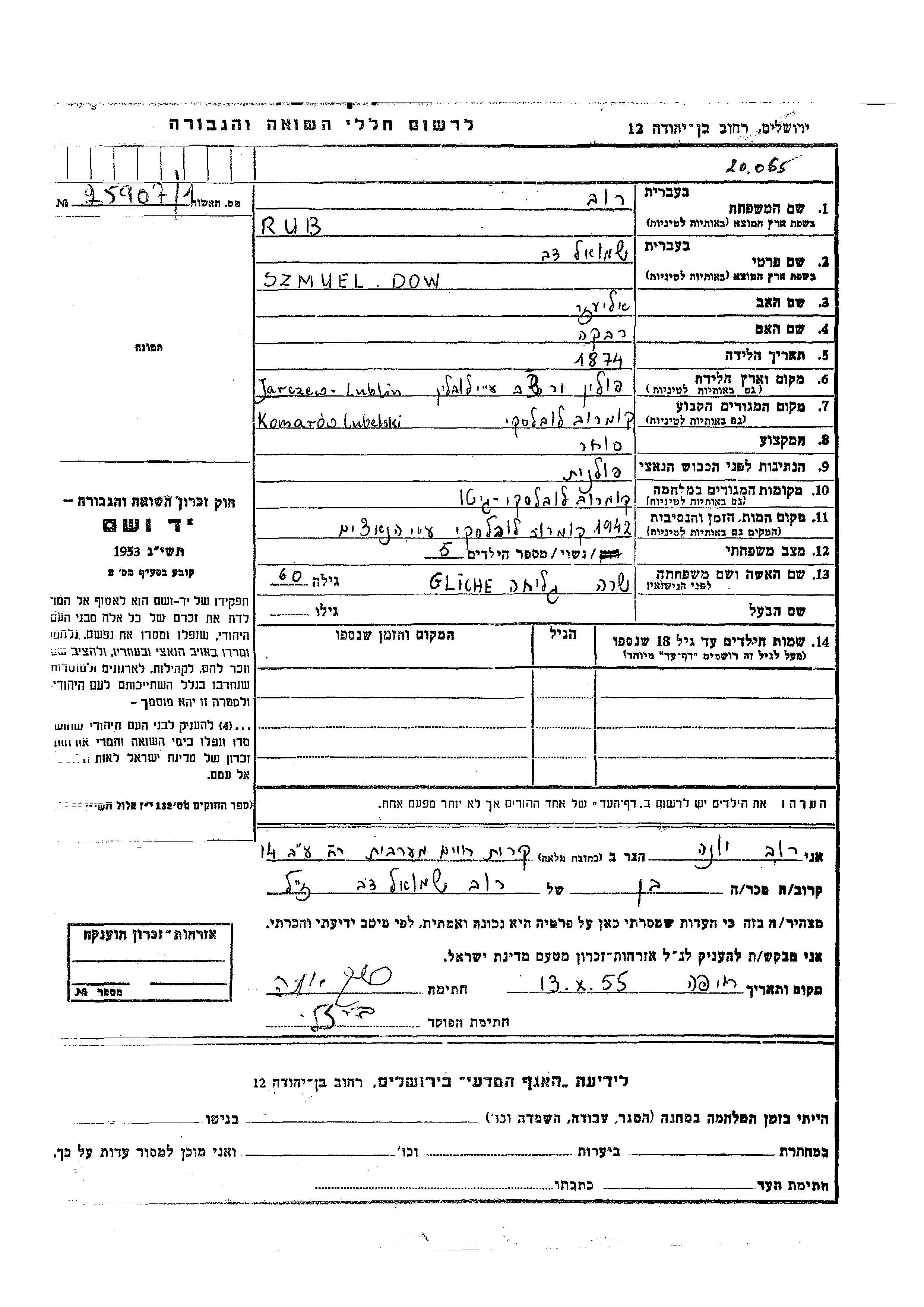 Szmuel Dow a été assassiné pendant la Shoah. Lieu de la mort: Komarow Lubelski, Pologne en 1942.
