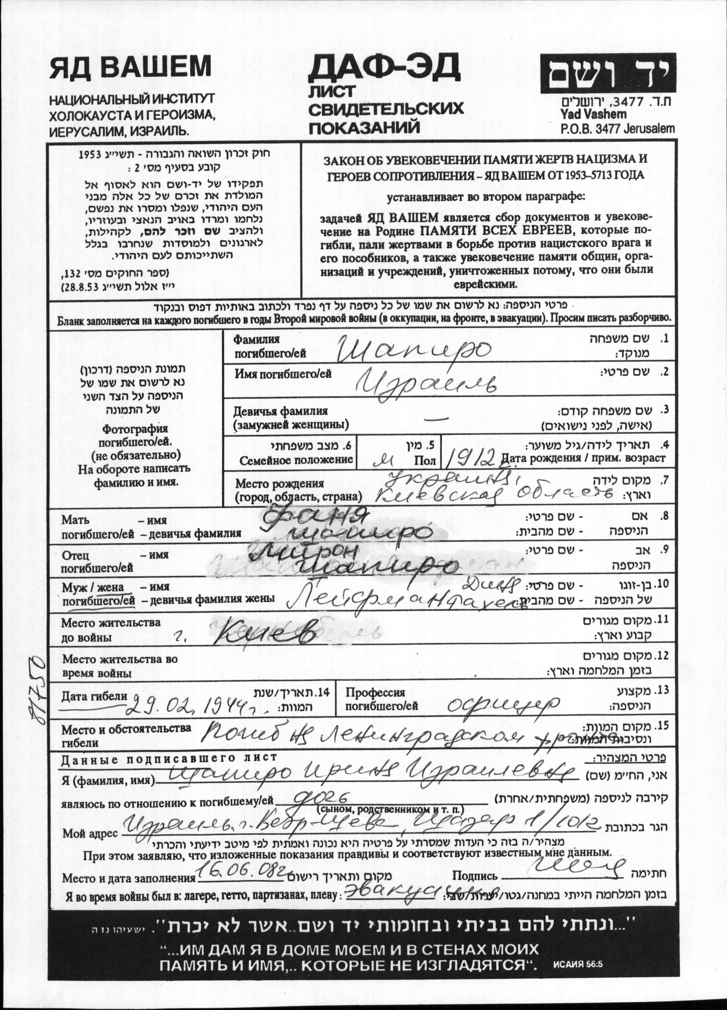 Izrail Shapiro est né à Kiev, Ukraine (URSS) en 1912, fils de Miron et de Fanya. Il était Ofitzer kadrovik et Mariée à Dina Rakhel née Leifman. Avant la seconde guerre mondiale il vivait à Kiev, Ukraine (URSS). Au cours de la guerre, il était à the Soviet armed forces. Izrail a été tué en tant que militaire pendant la Seconde Guerre mondiale. Lieu de la mort: Leningrad, Russie (URSS) en 29/02/1944.