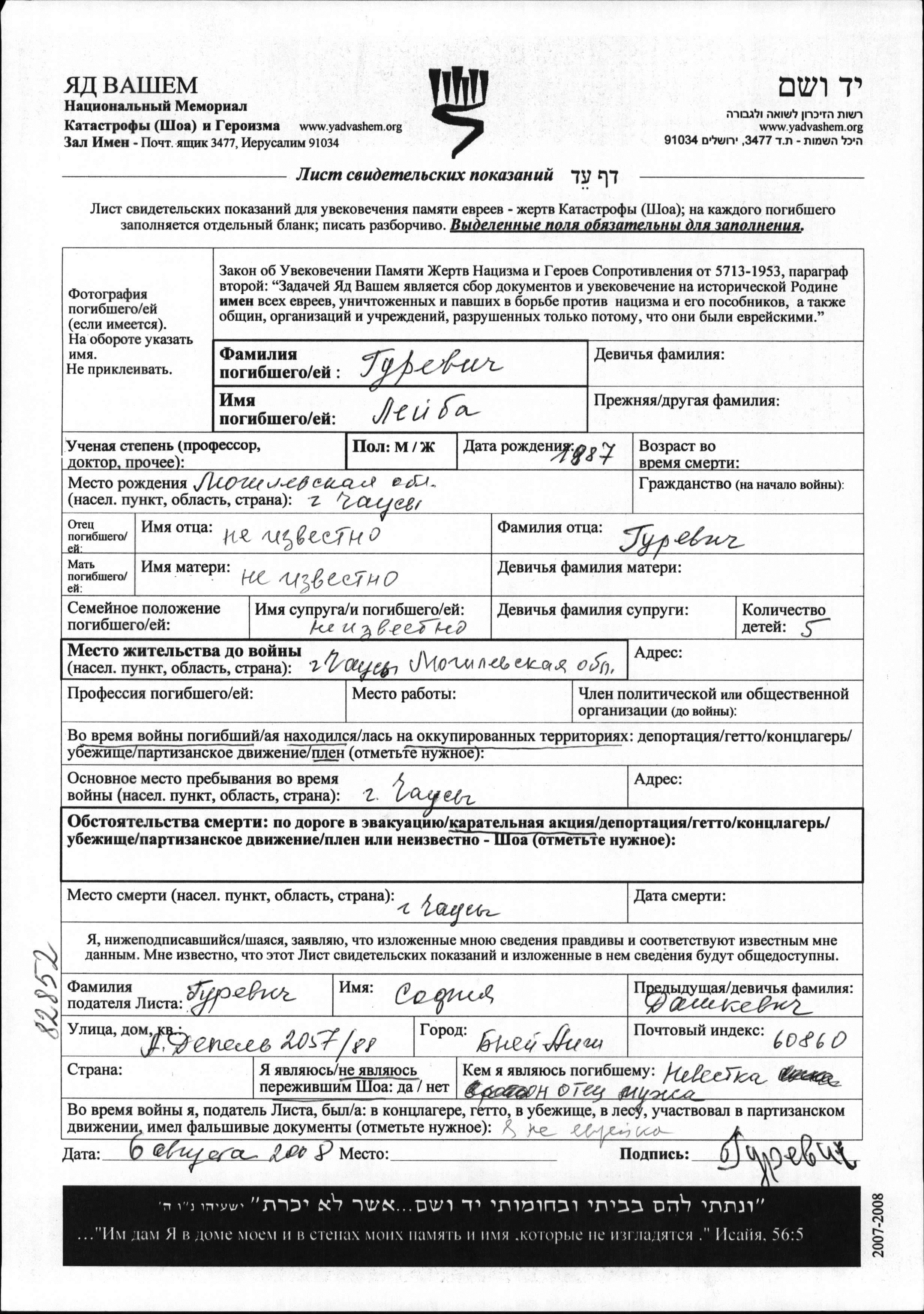 Gurevich Leiba 1887 Chausy, Bélorussie (URSS) Feuille de témoignage