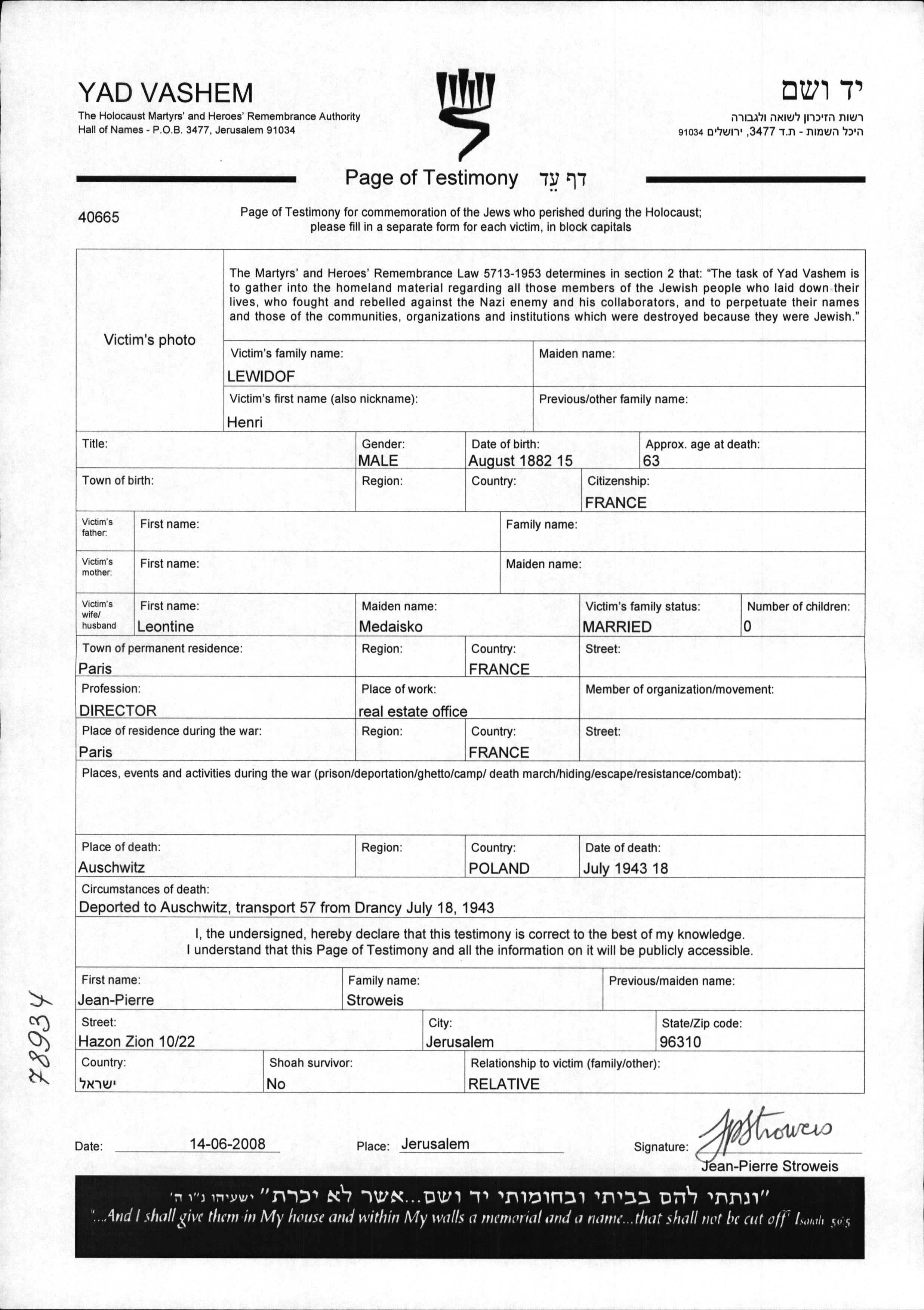 Henri Lewidof est né en 1882. Il était Directeur/directrice et Mariée à Leontine née Medaisko. Avant la seconde guerre mondiale il vivait à Paris, France. Au cours de la guerre, il était à Paris, France. Henri a été assassiné pendant la Shoah. Lieu de la mort: Auschwitz, Pologne en 18/07/1943.