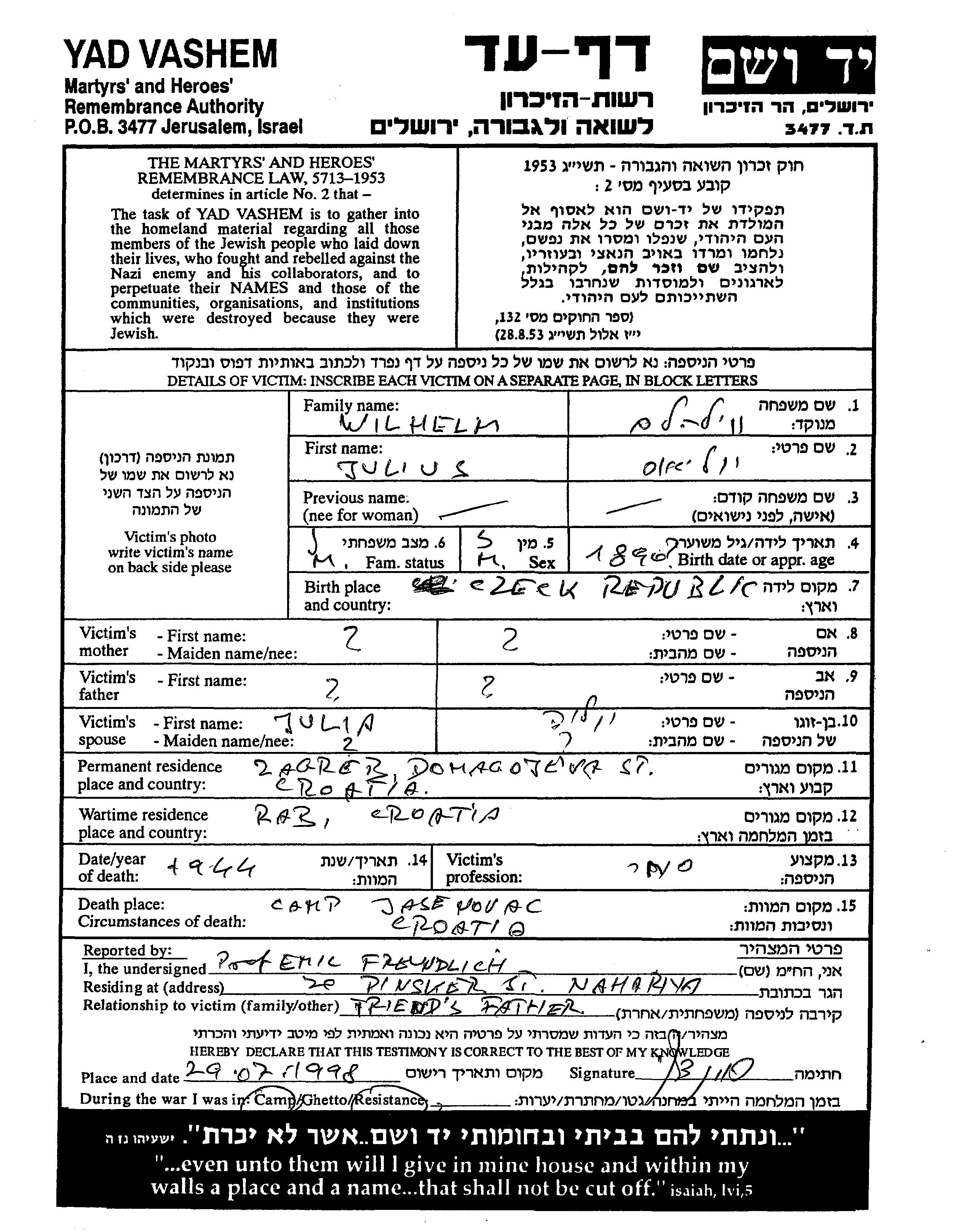 Julius Wilhelm est né à Tchécoslovaquie en 1890. Il était Commerçant/e et Mariée à Julia. Avant la seconde guerre mondiale il vivait à Zagreb, Yugoslavie. Au cours de la guerre, il était à Rab, Yugoslavie.