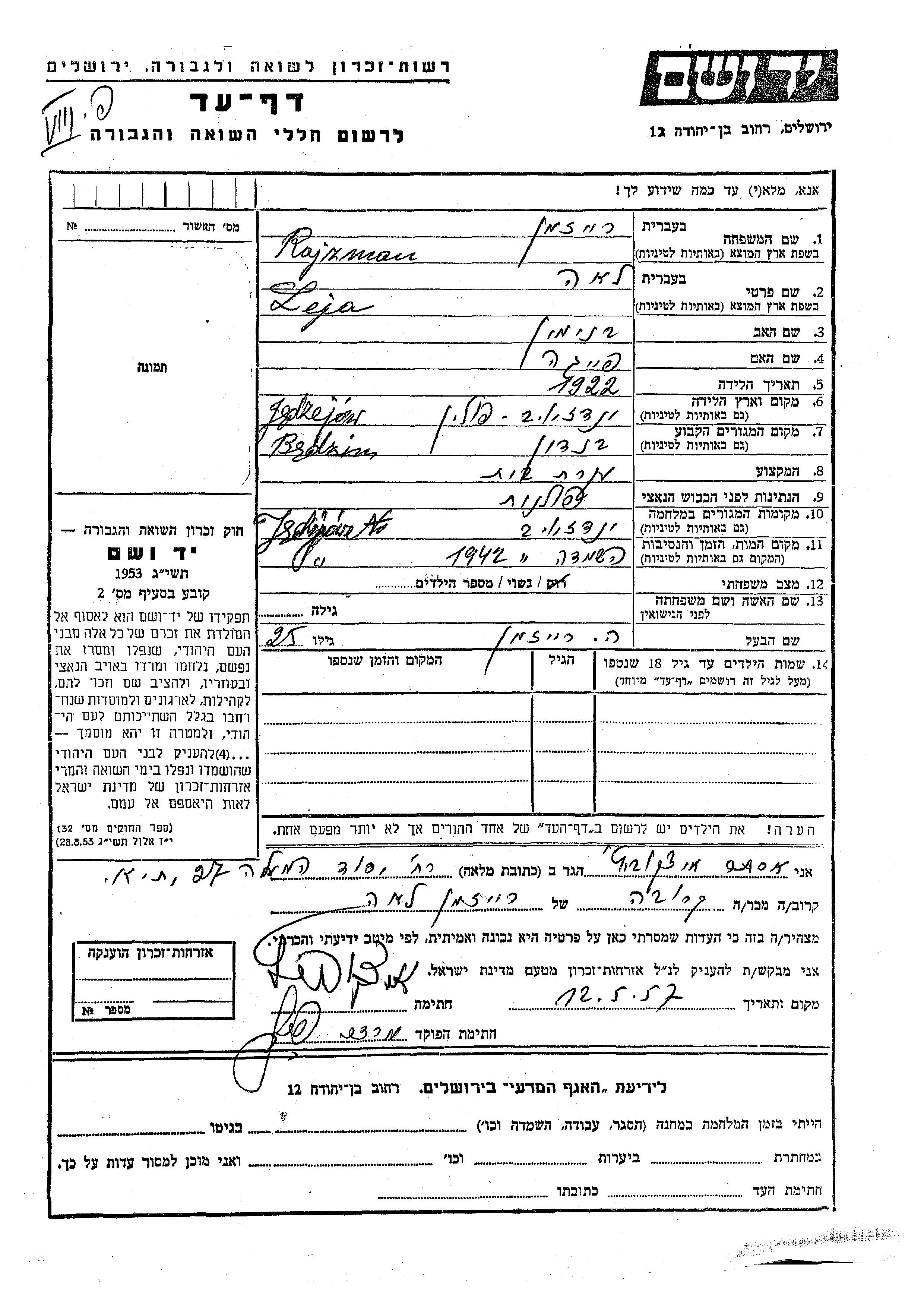 Rajzman Leja 1922 Będzin, Pologne Feuille de témoignage