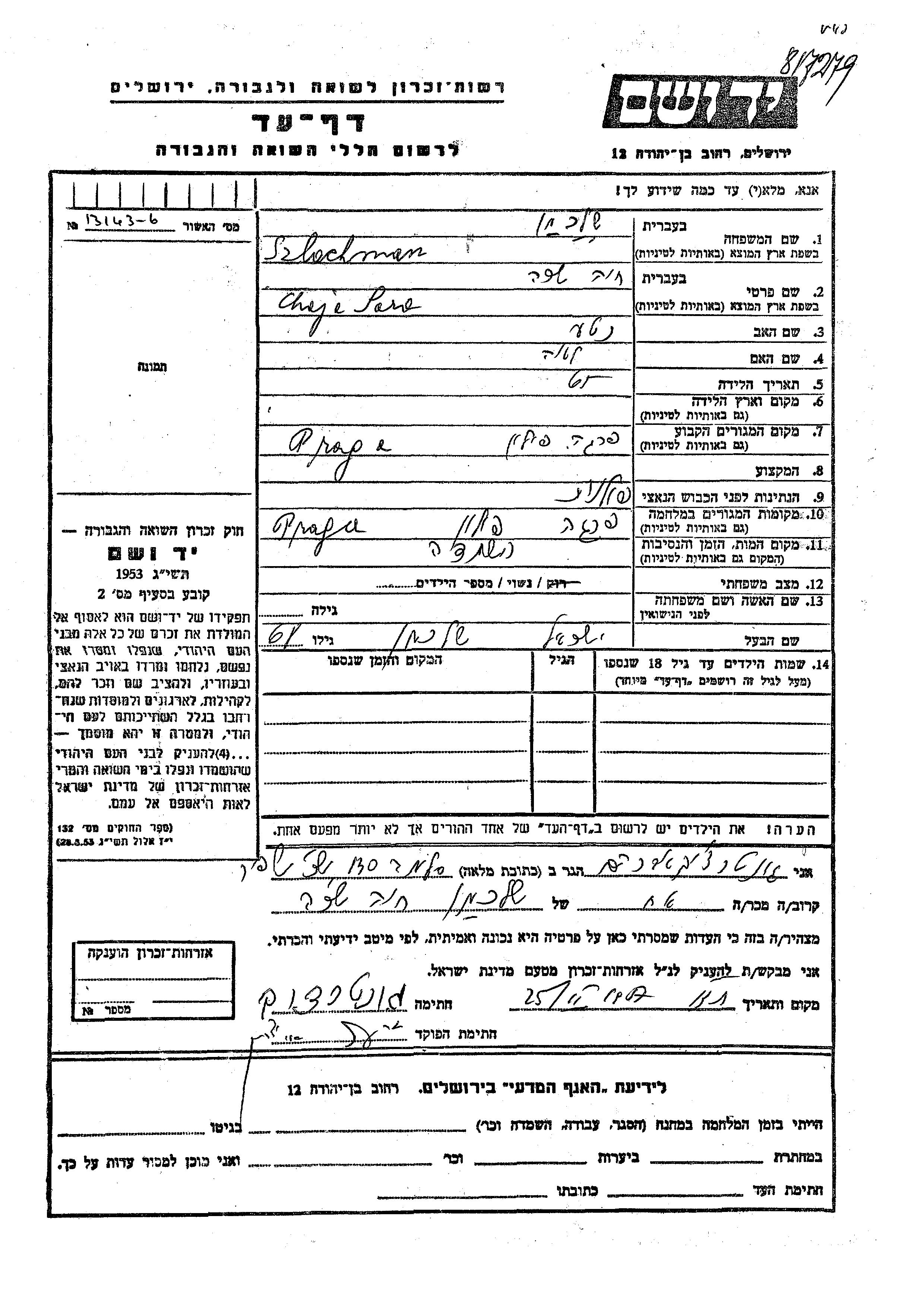 Szlachman Chaja Sara Praga Warszawa, Pologne Feuille de témoignage