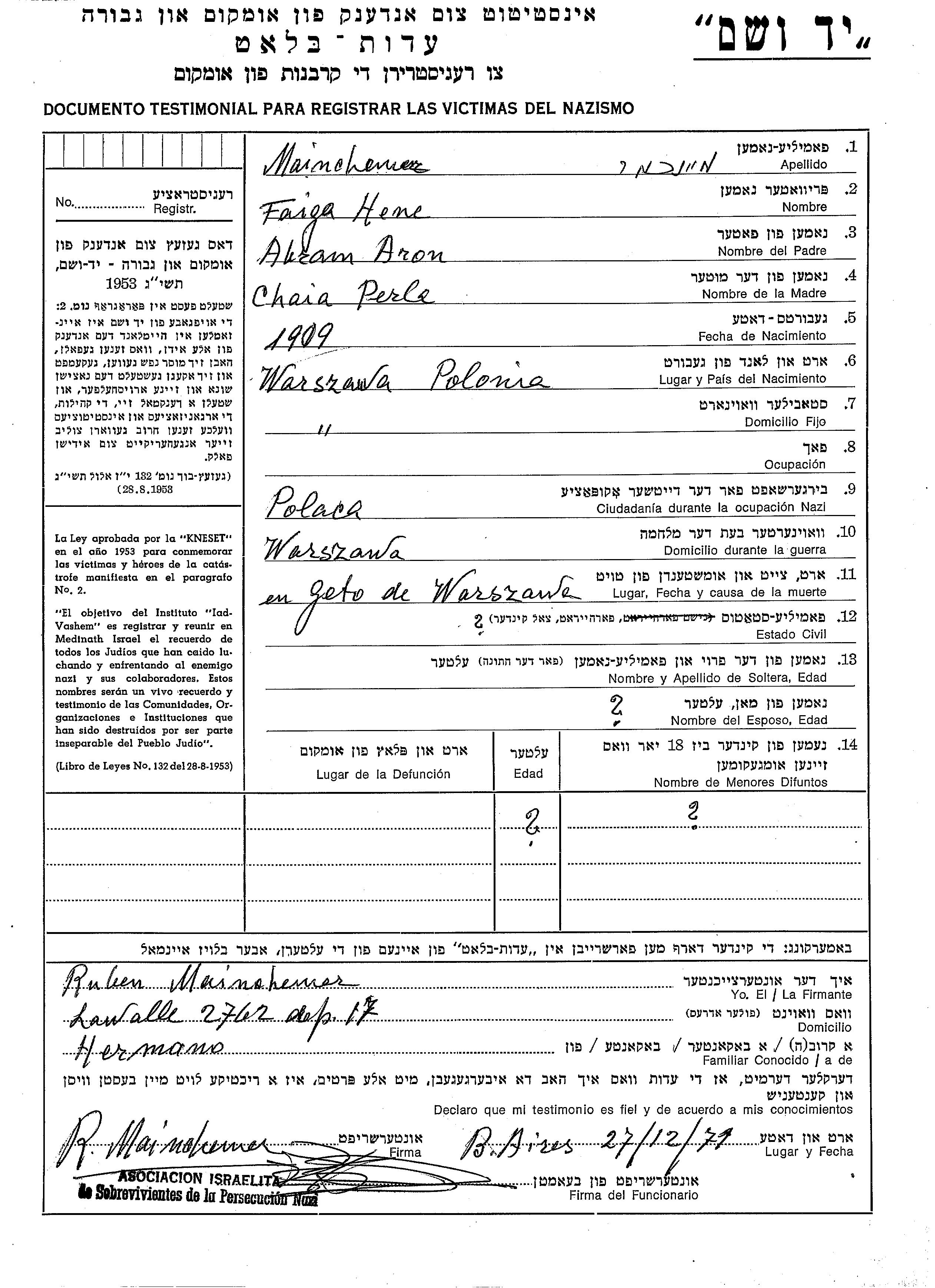 Mainchemer Faiga Hene 1909 Varsha, Pologne Feuille de témoignage