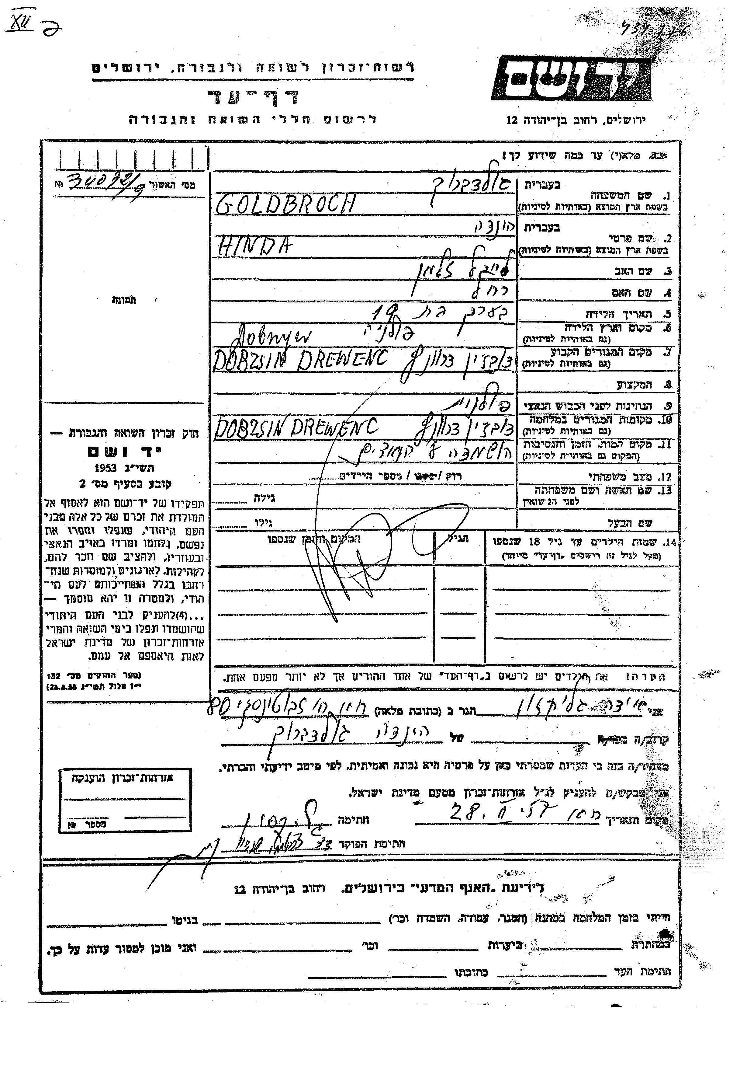 Hinda Goldbroch est née à Pologne, fille de Leibel Zalman et de Rakhel. Elle était Célibataire. Avant la seconde guerre mondiale elle vivait à Dobrzyn nad Drweca, Pologne. Pendant la guerre, elle était à Dobrzyn nad Drweca, Pologne.