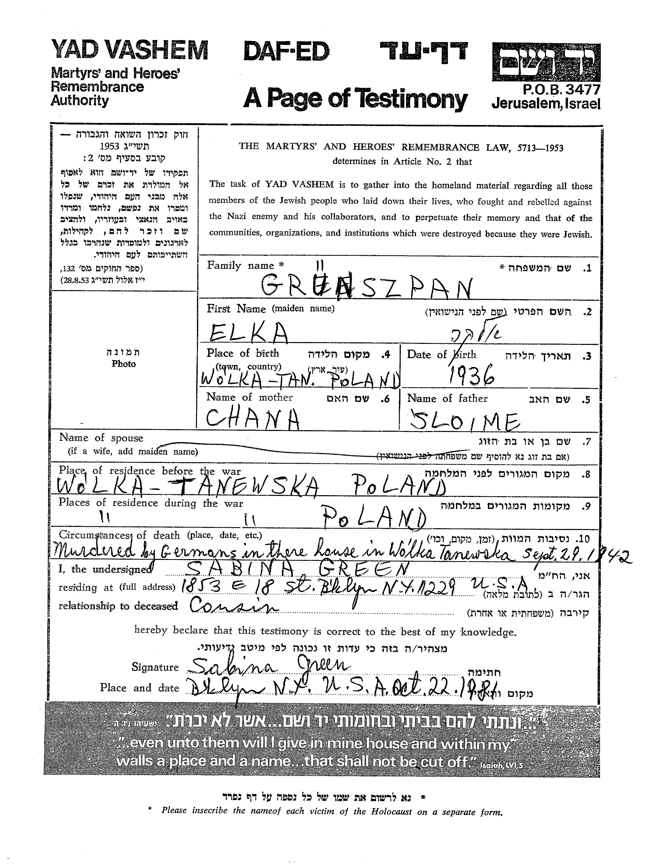 Grunszpan Elka 1936 Wolka Tanewska, Pologne Feuille de témoignage