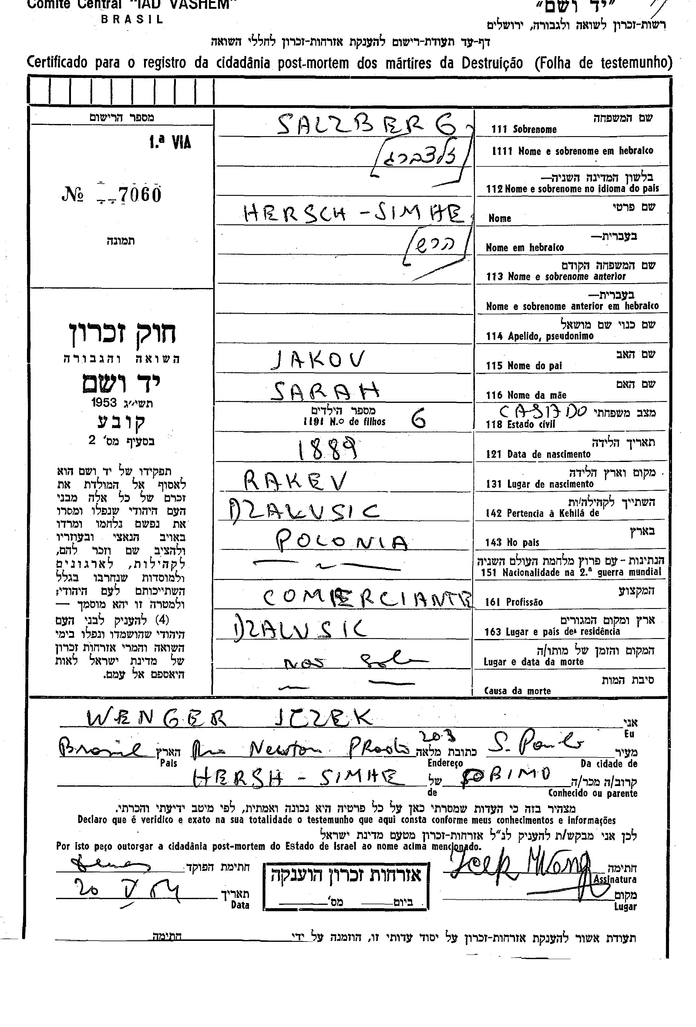 Salzberg Hersch Simhe 1889 Dzaloshitz, Pologne Feuille de témoignage