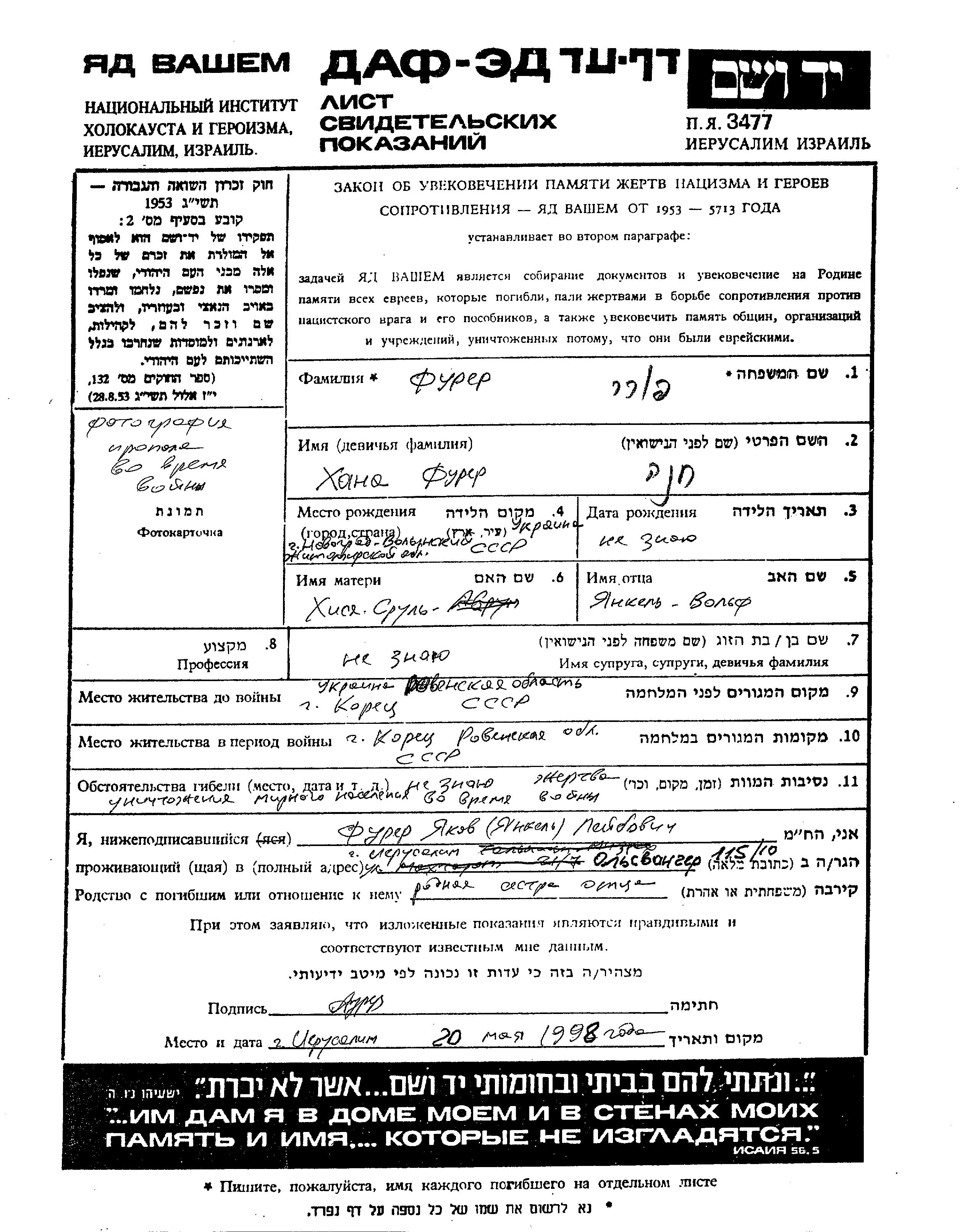 Furer Khana Koretz, Pologne Feuille de témoignage
