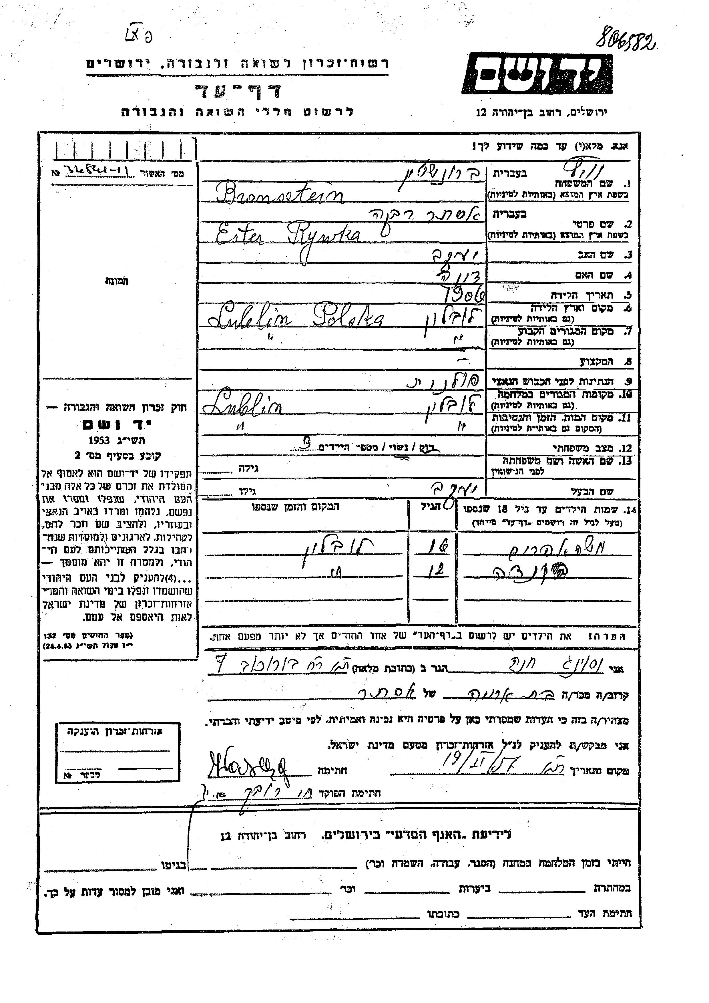 Bronsztein Rywka Ester 1906 Lublin, Pologne Feuille de témoignage