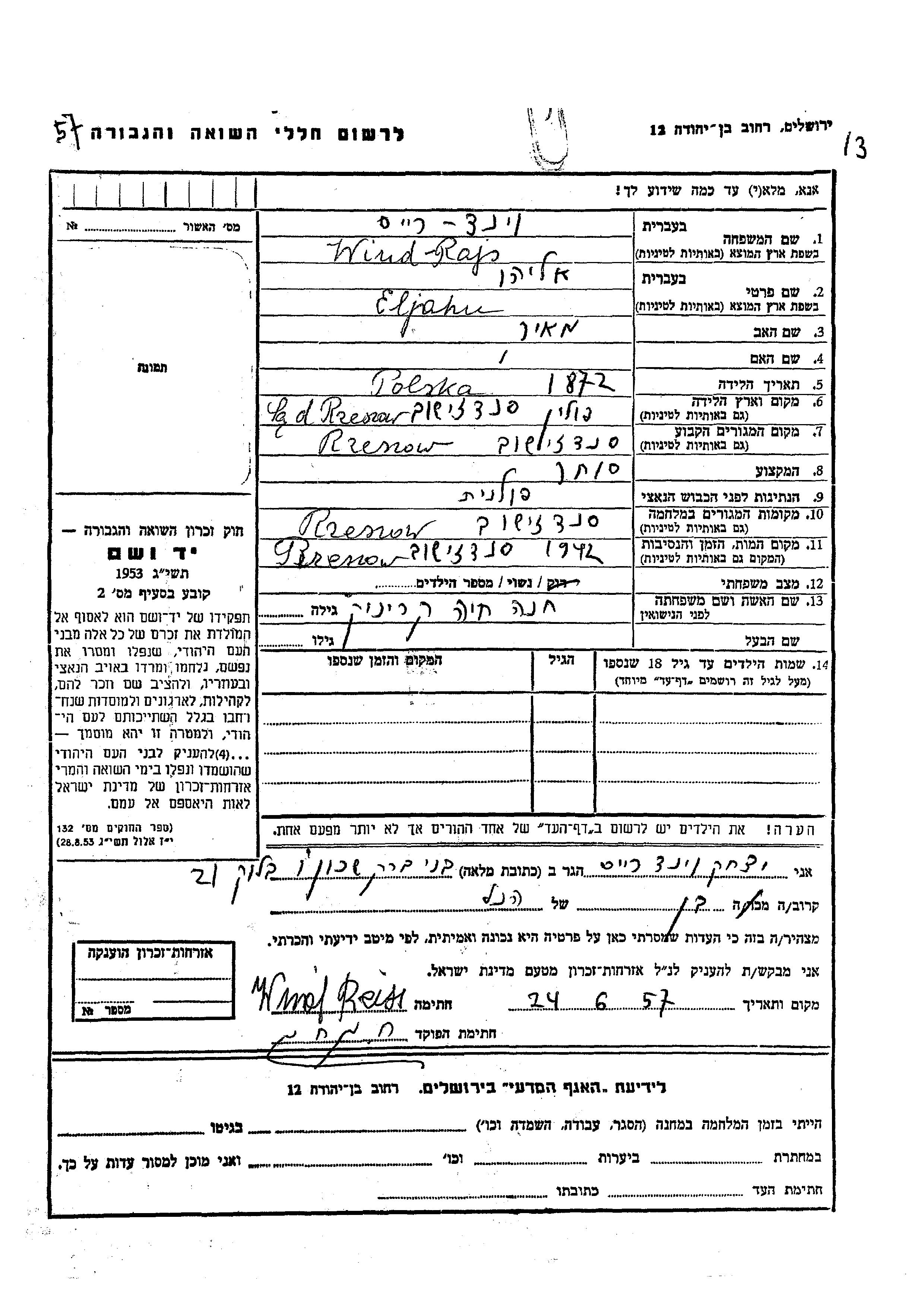 Wind Rajs Eljahu 1872 Rzeszow, Pologne Feuille de témoignage