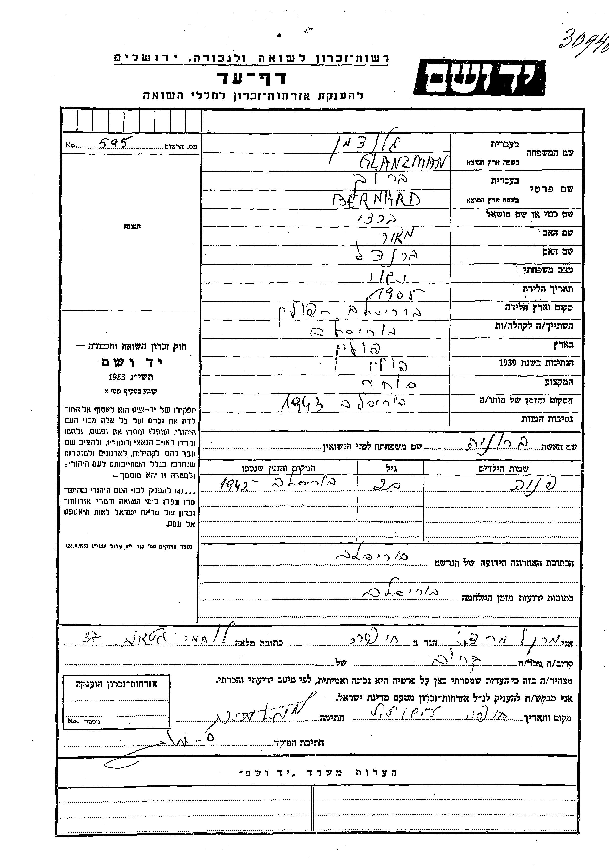 Glanzman Bernard Barukh 1905 Pologne Feuille de témoignage