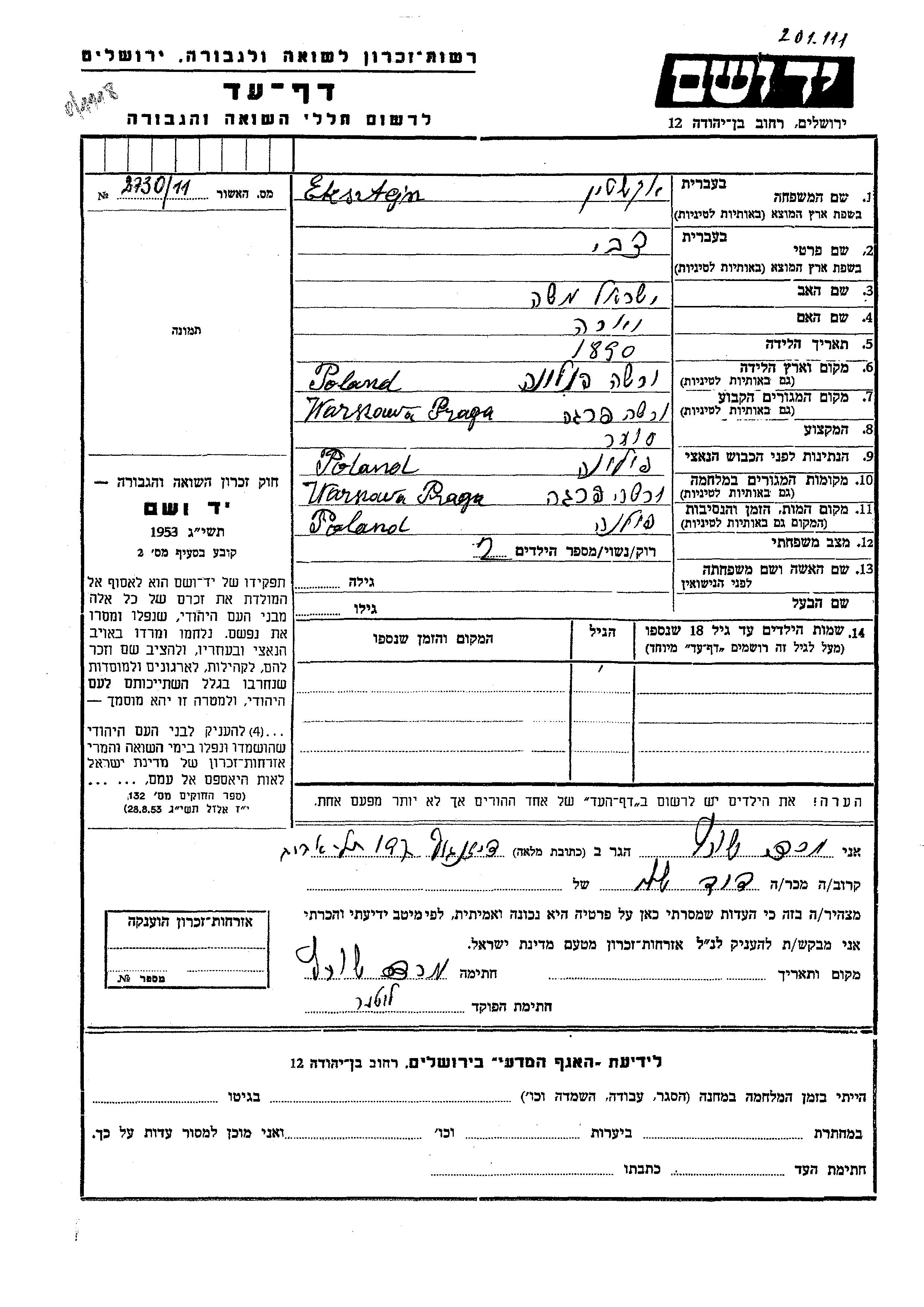 Eksztejn Tzvi 1890 Praga Warszawa, Pologne Feuille de témoignage