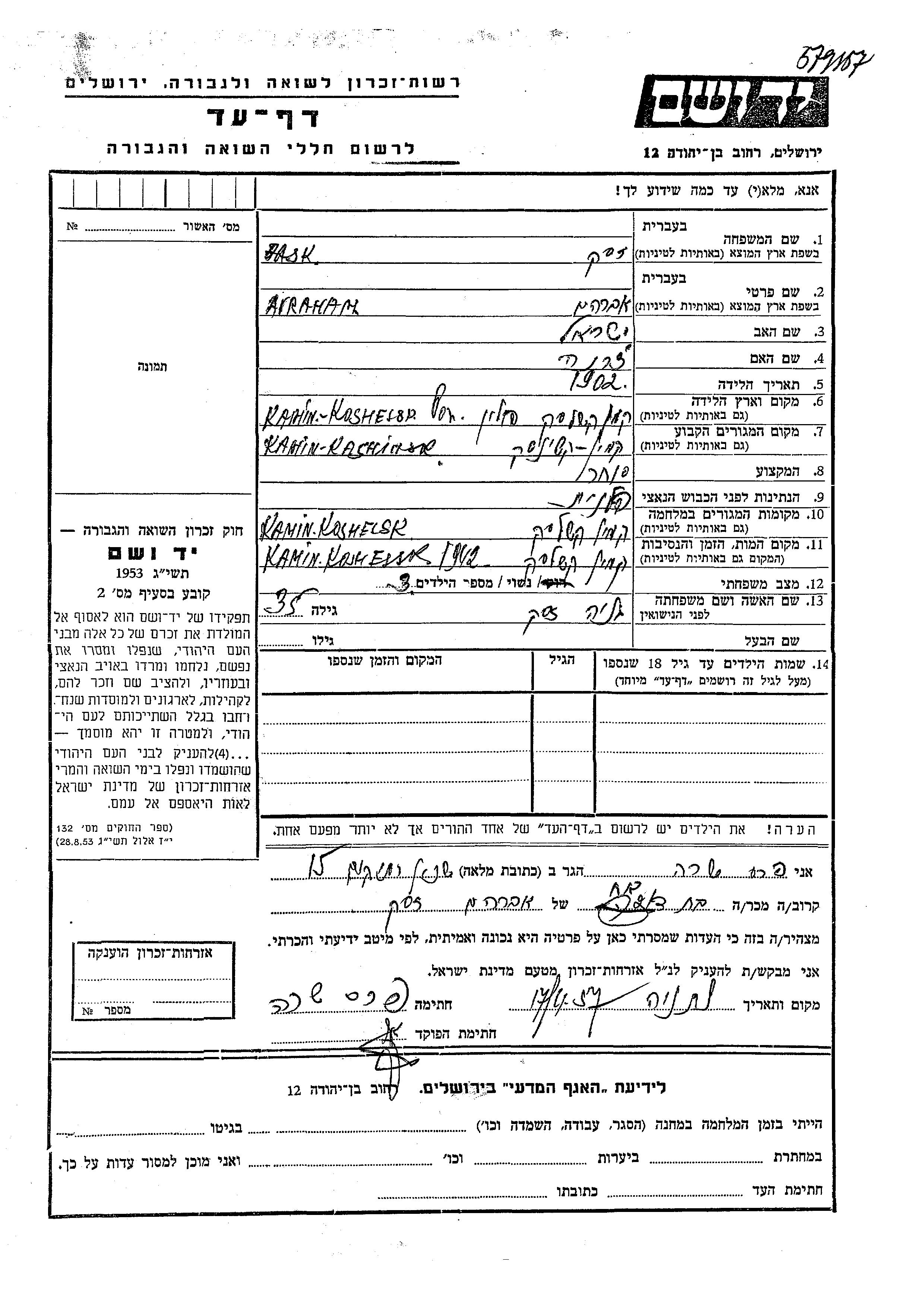 Zask Avraham 1902 Kamin Kashirski, Pologne Feuille de témoignage