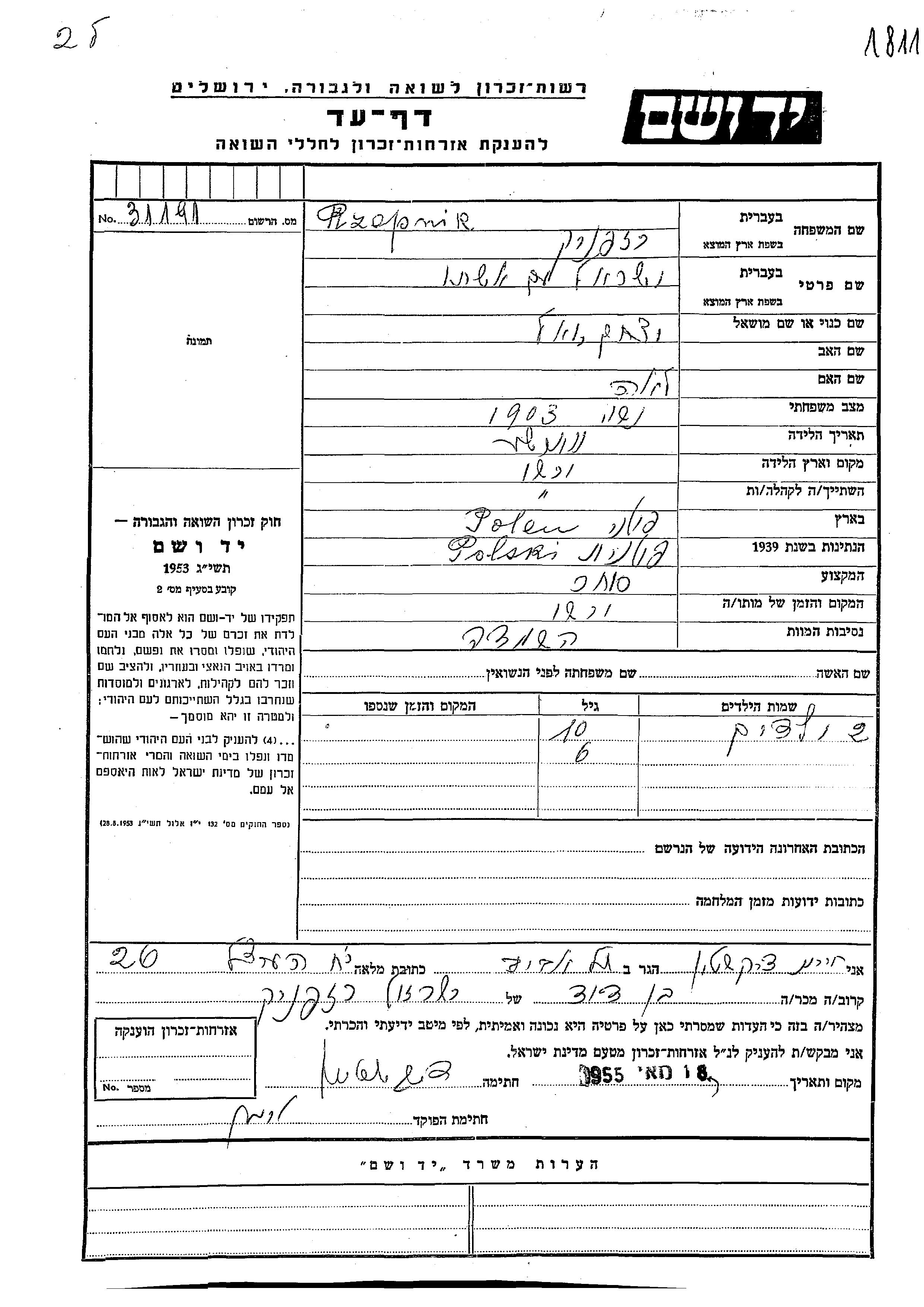 Rzepnik Yisrael Yitzkhak Yoel 1903 Warszawa, Pologne Feuille de témoignage