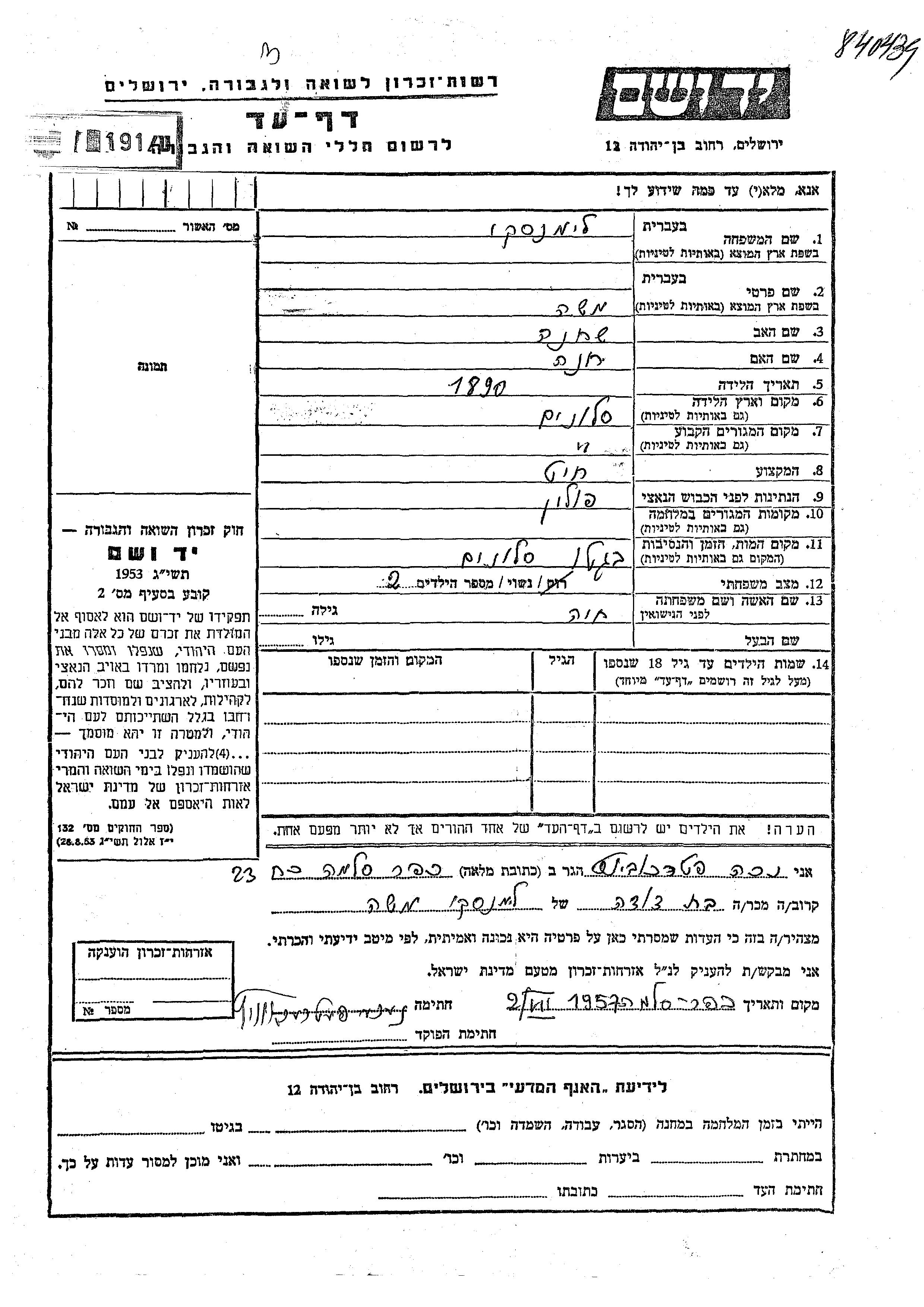 Limanski Moshe 1890 Slonim, Pologne Feuille de témoignage