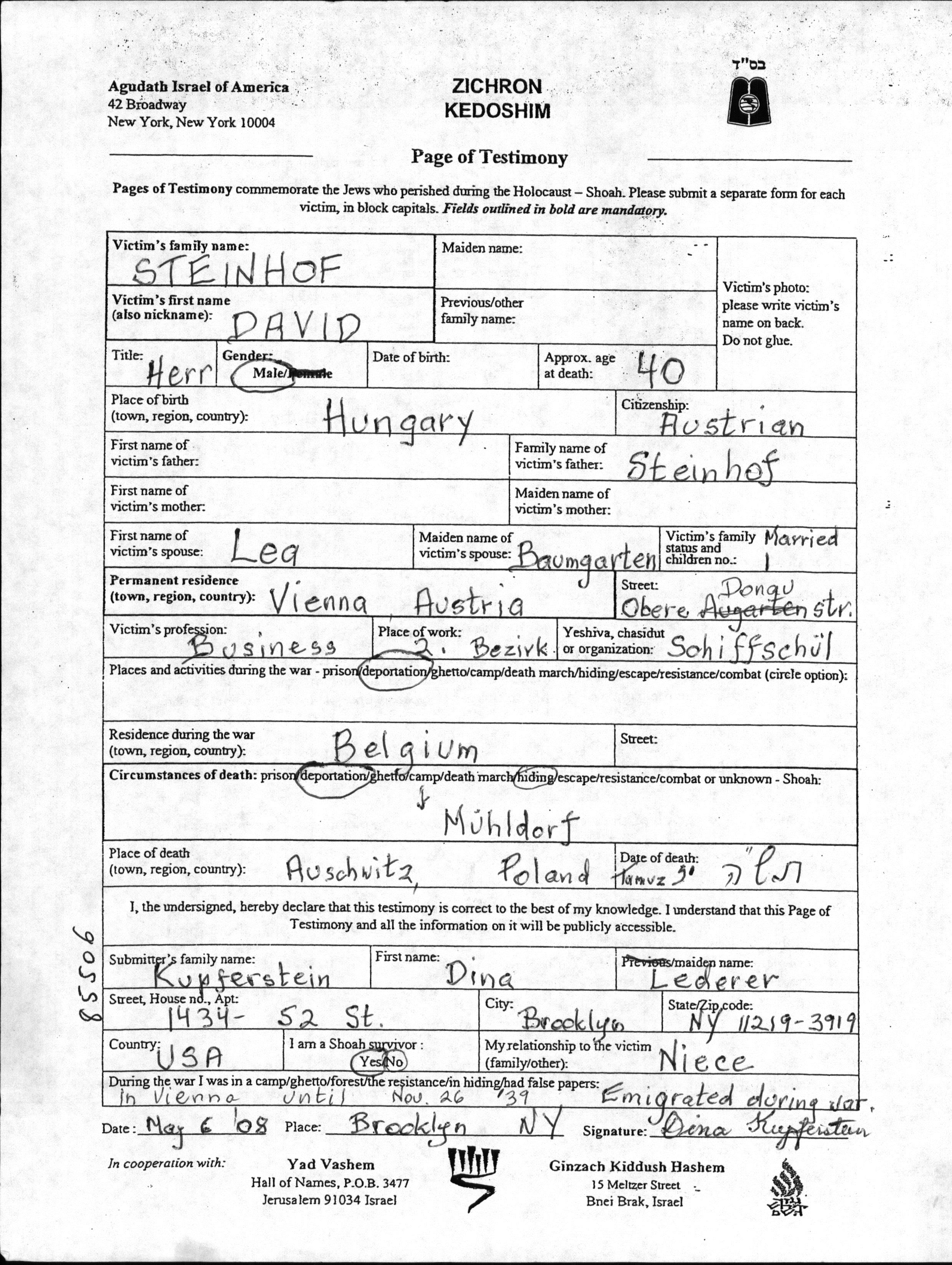 David Steinhof est né à Hongrie. Il était Affaires et Mariée à Lea née Baumgarten. Avant la seconde guerre mondiale il vivait à Vienna, Autriche. Au cours de la guerre, il était à Belgique.
