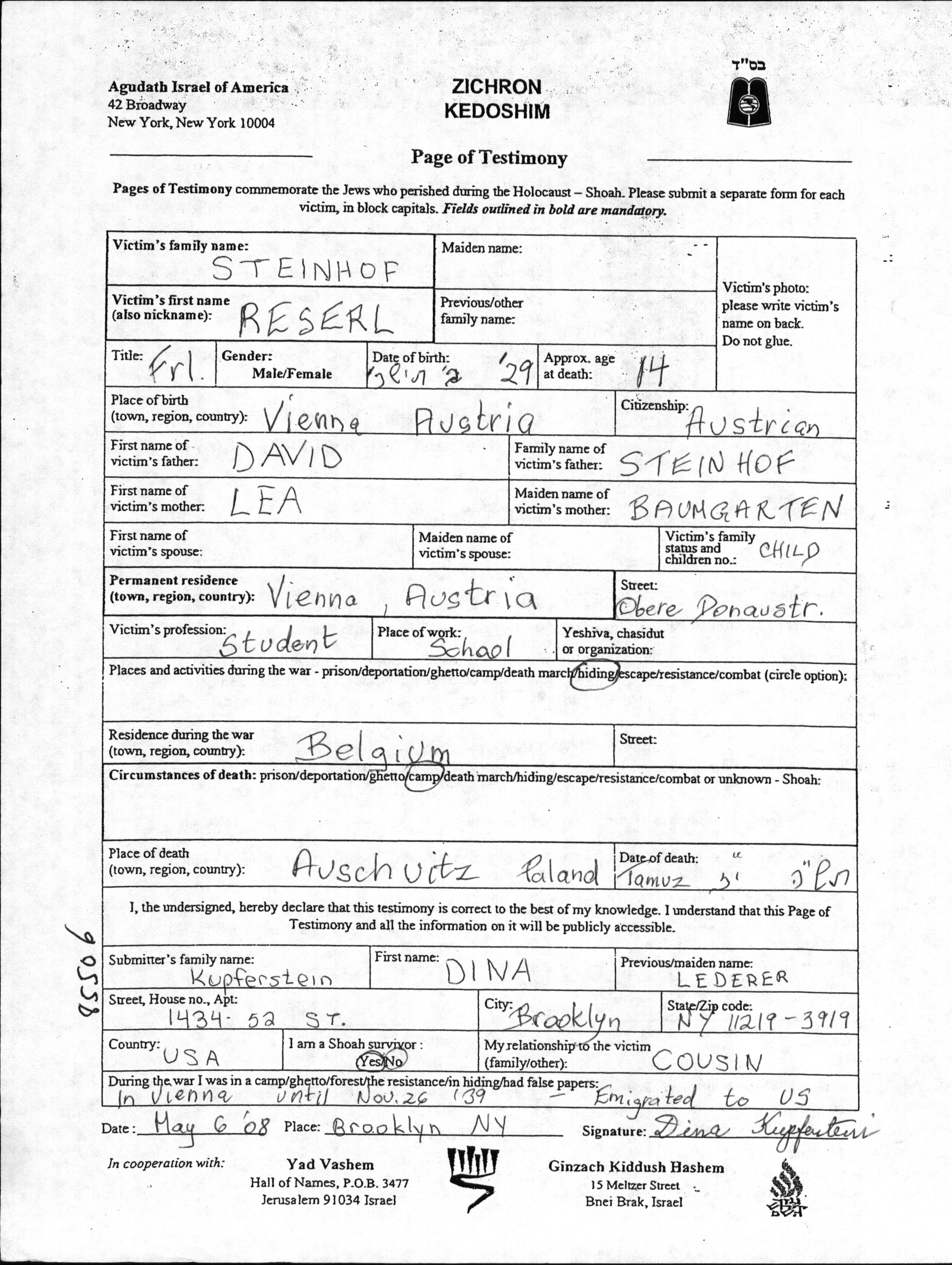 Reserl Steinhof est née à Vienna, Autriche en 1929, fille de David et de Lea née Baumgarten. Elle était Étudiant/e et Adolescent. Avant la seconde guerre mondiale elle vivait à Vienna, Autriche. Pendant la guerre, elle était à Belgique.