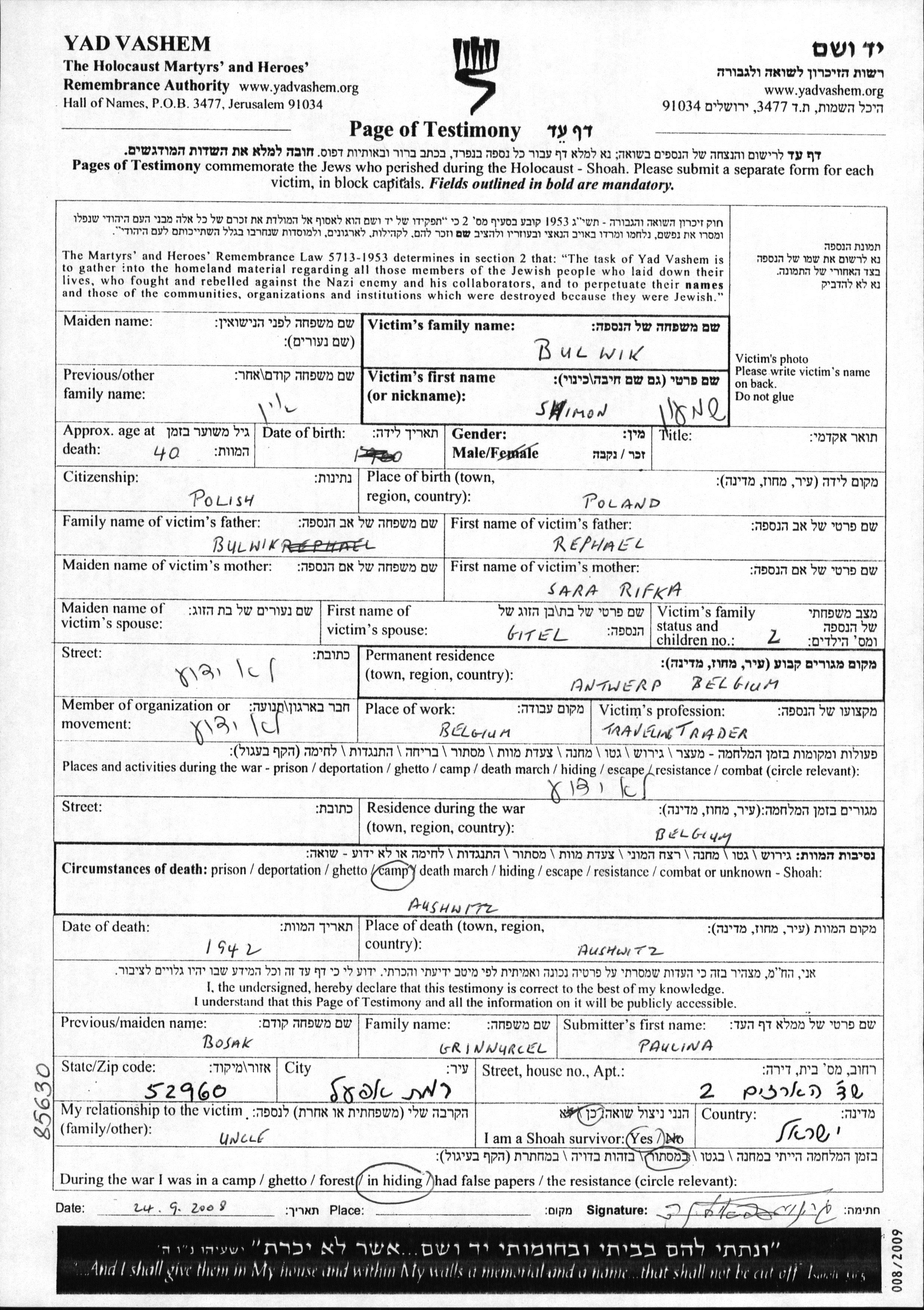 Bulwik Shimon Antwerpen, Belgique Feuille de témoignage