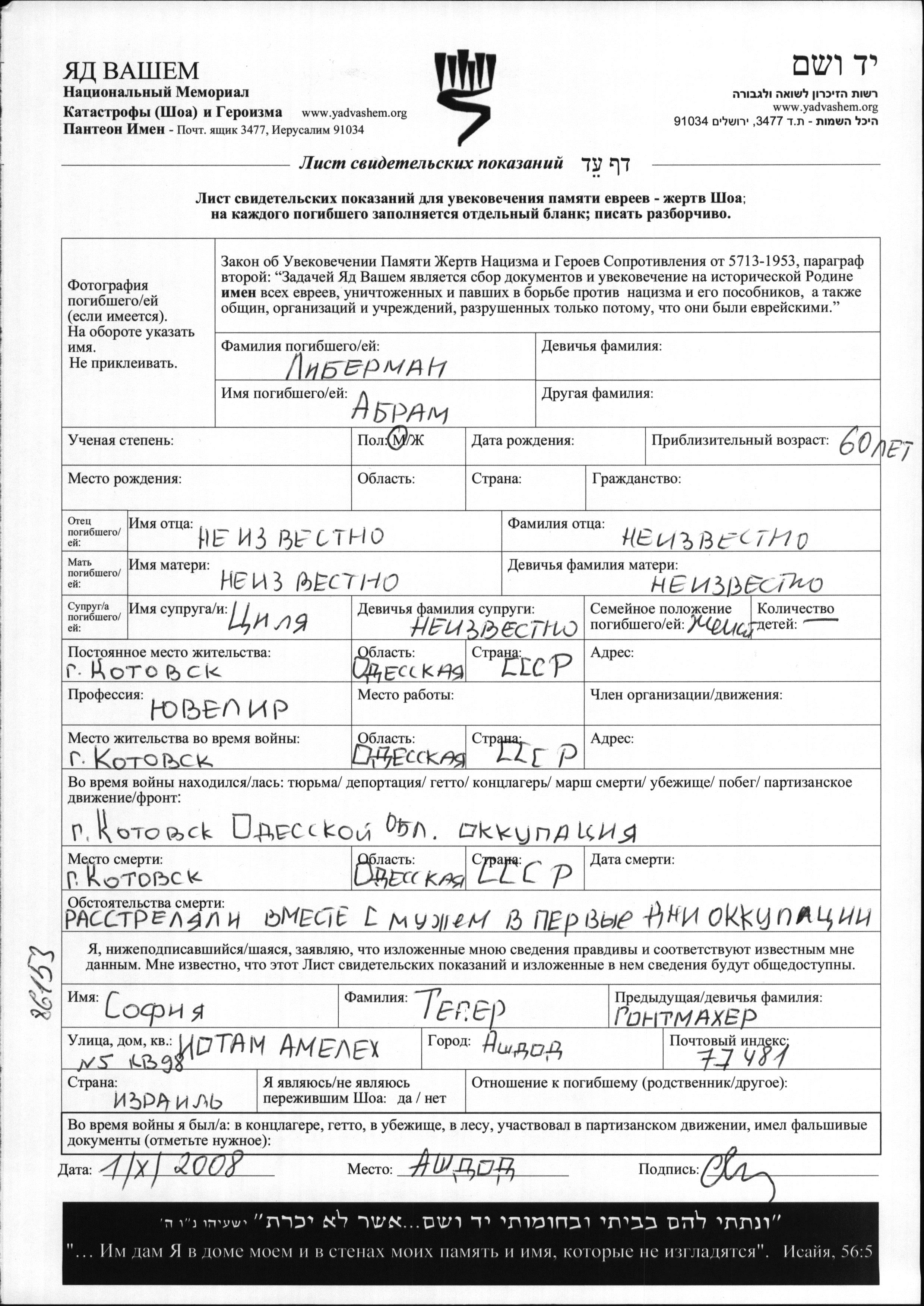 Liberman Abram Kotovsk, Ukraine (URSS) Feuille de témoignage