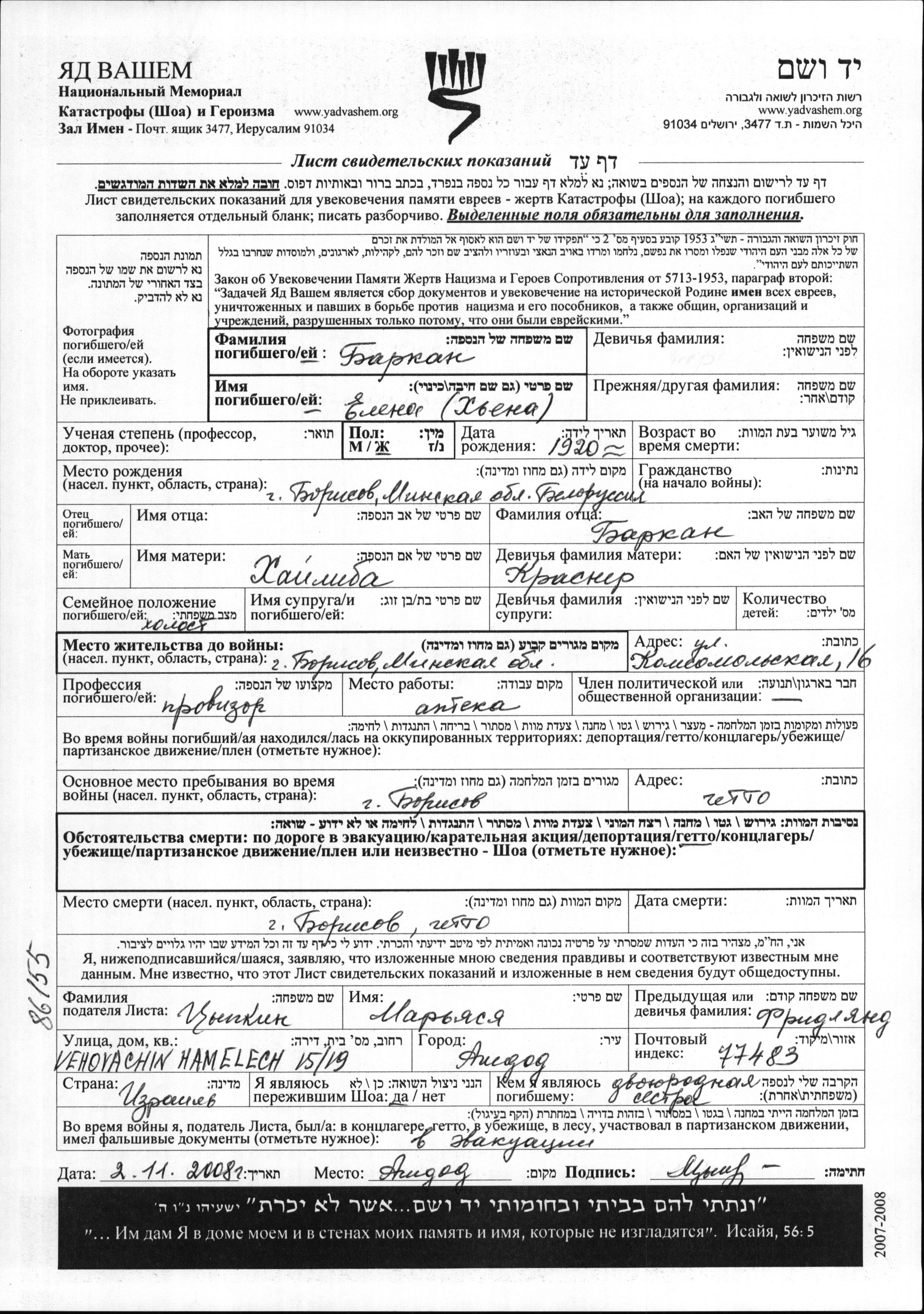 Barkan Yelena Khyena 1920 Borisov, Bélorussie (URSS) Feuille de témoignage