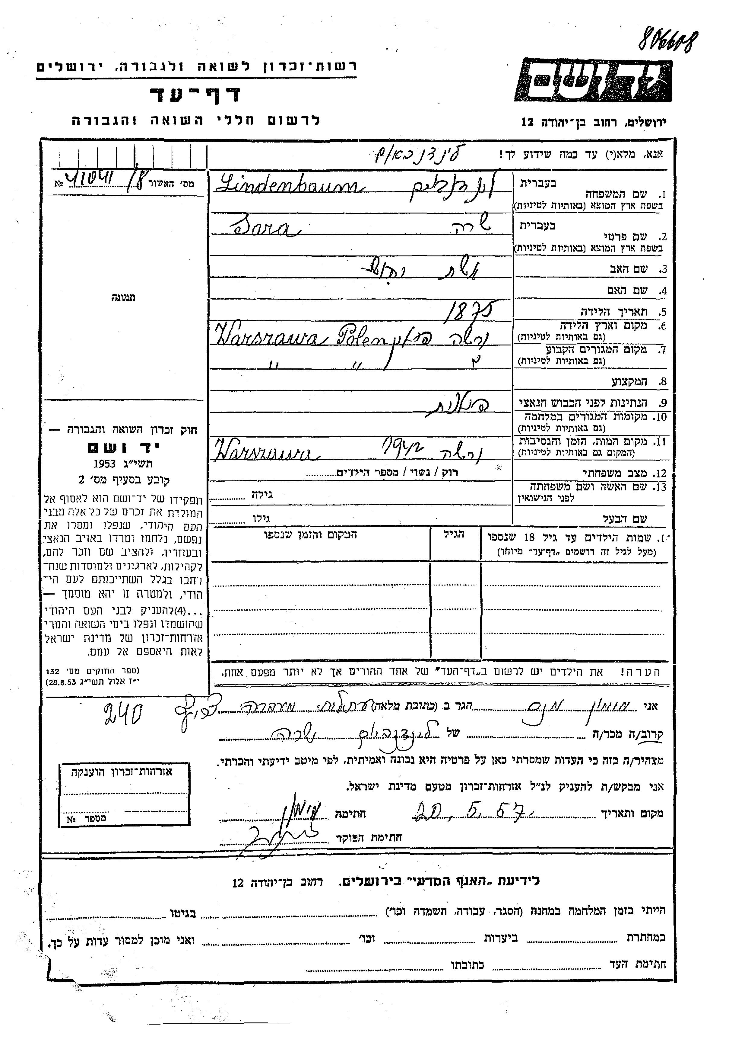 Lindenbaum Sara 1875 Warszawa, Pologne Feuille de témoignage