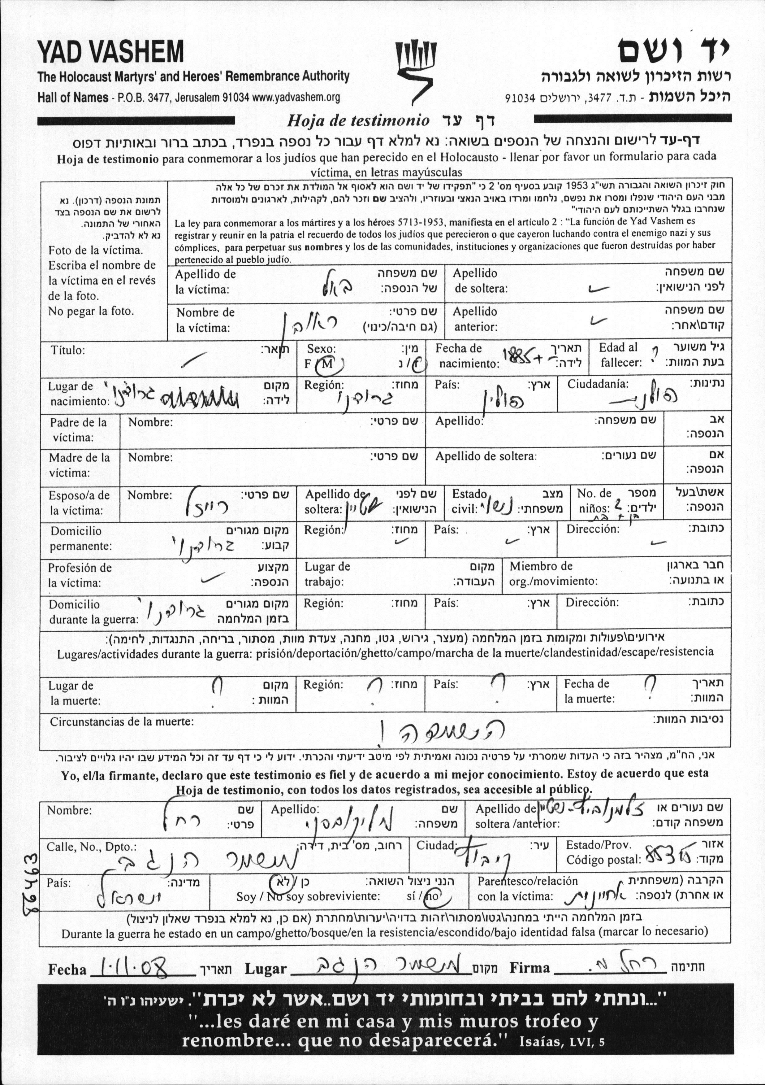 Yad Vashem - Pages of Testimony Names Memorial Collection