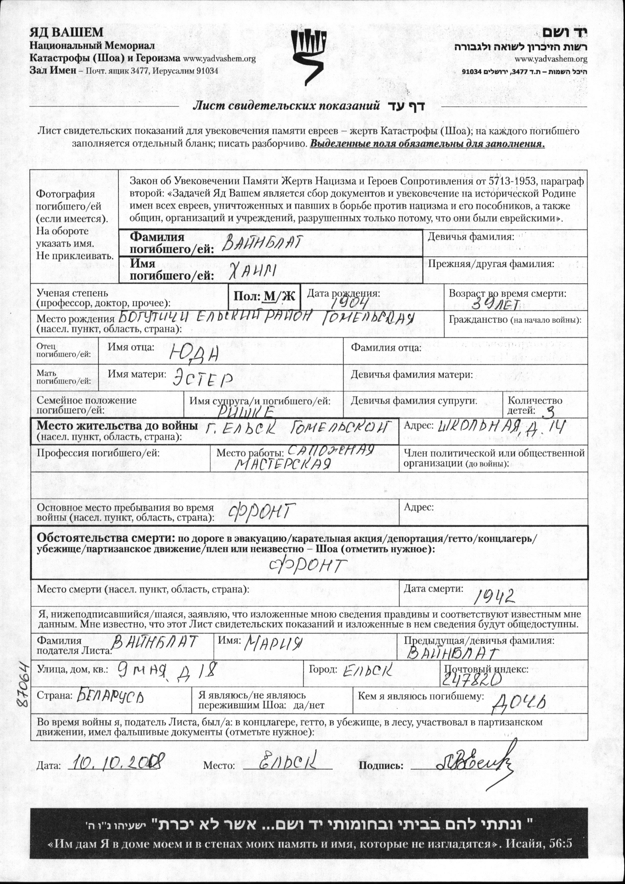 Vainblat Khaim 1904 Yelsk, Bélorussie (URSS) Feuille de témoignage