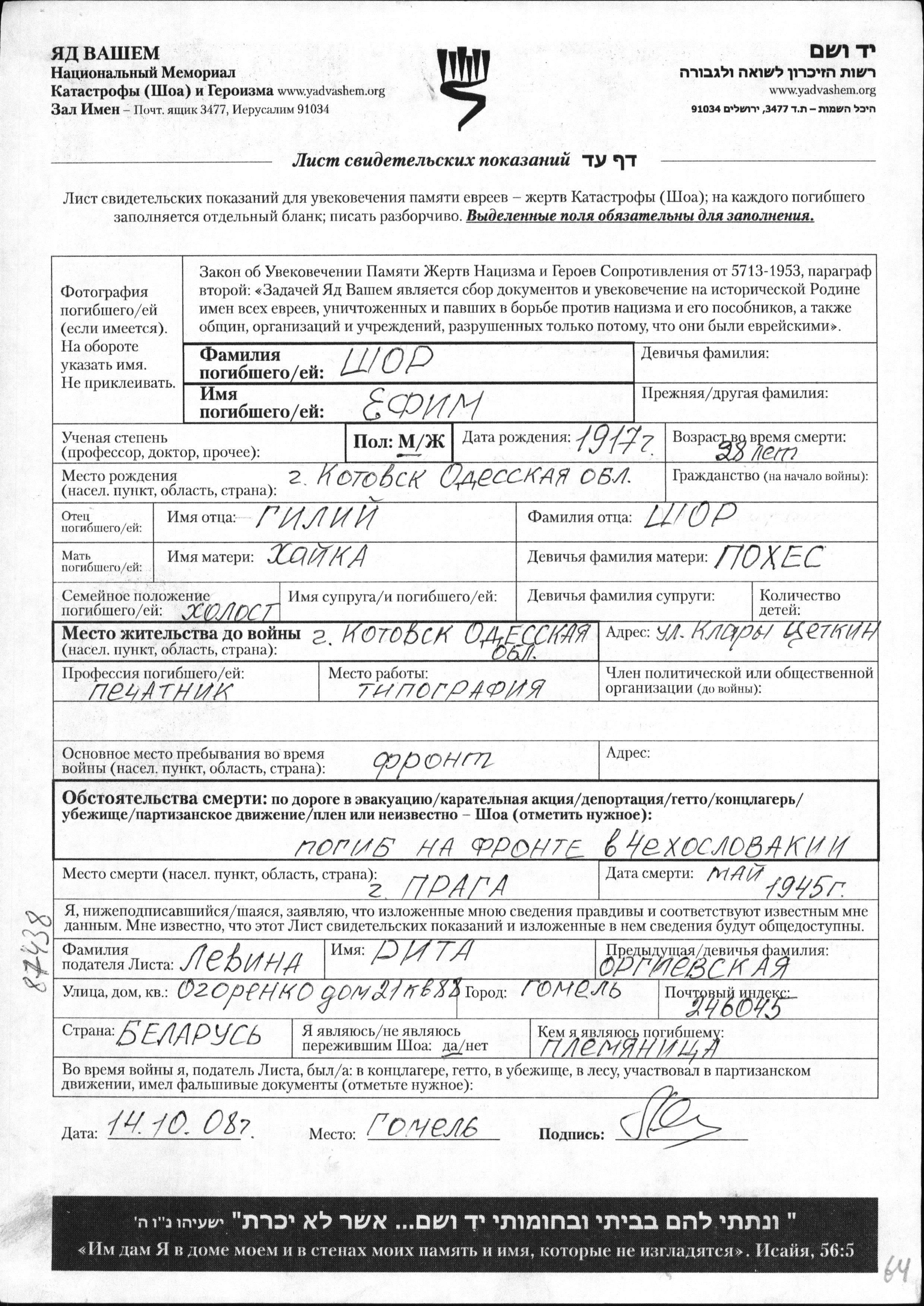 Yefim Shor est né à Kotovsk, Ukraine (URSS) en 1917, fils de Giliy et de Khayka née Pokhes. Il était Imprimeur et Célibataire. Avant la seconde guerre mondiale il vivait à Kotovsk, Ukraine (URSS). Au cours de la guerre, il était à the Soviet armed forces. Yefim a été tué en tant que militaire pendant la Seconde Guerre mondiale. Lieu de la mort: Prague, Tchécoslovaquie en 05/1945.