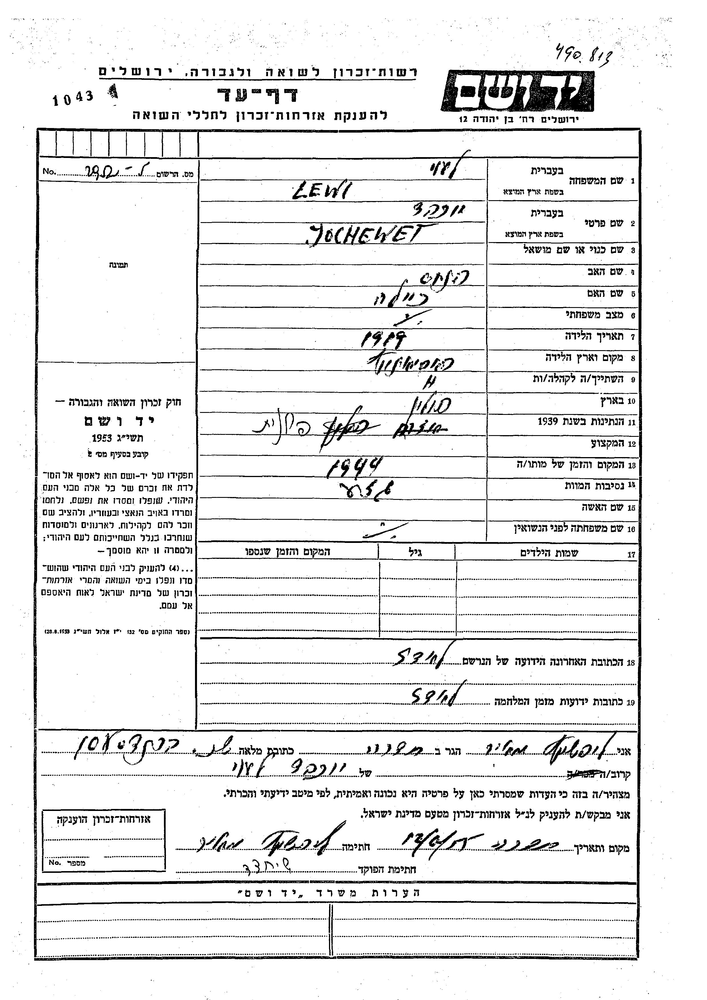 Lewi Jochewet 1919 Pologne Feuille de témoignage