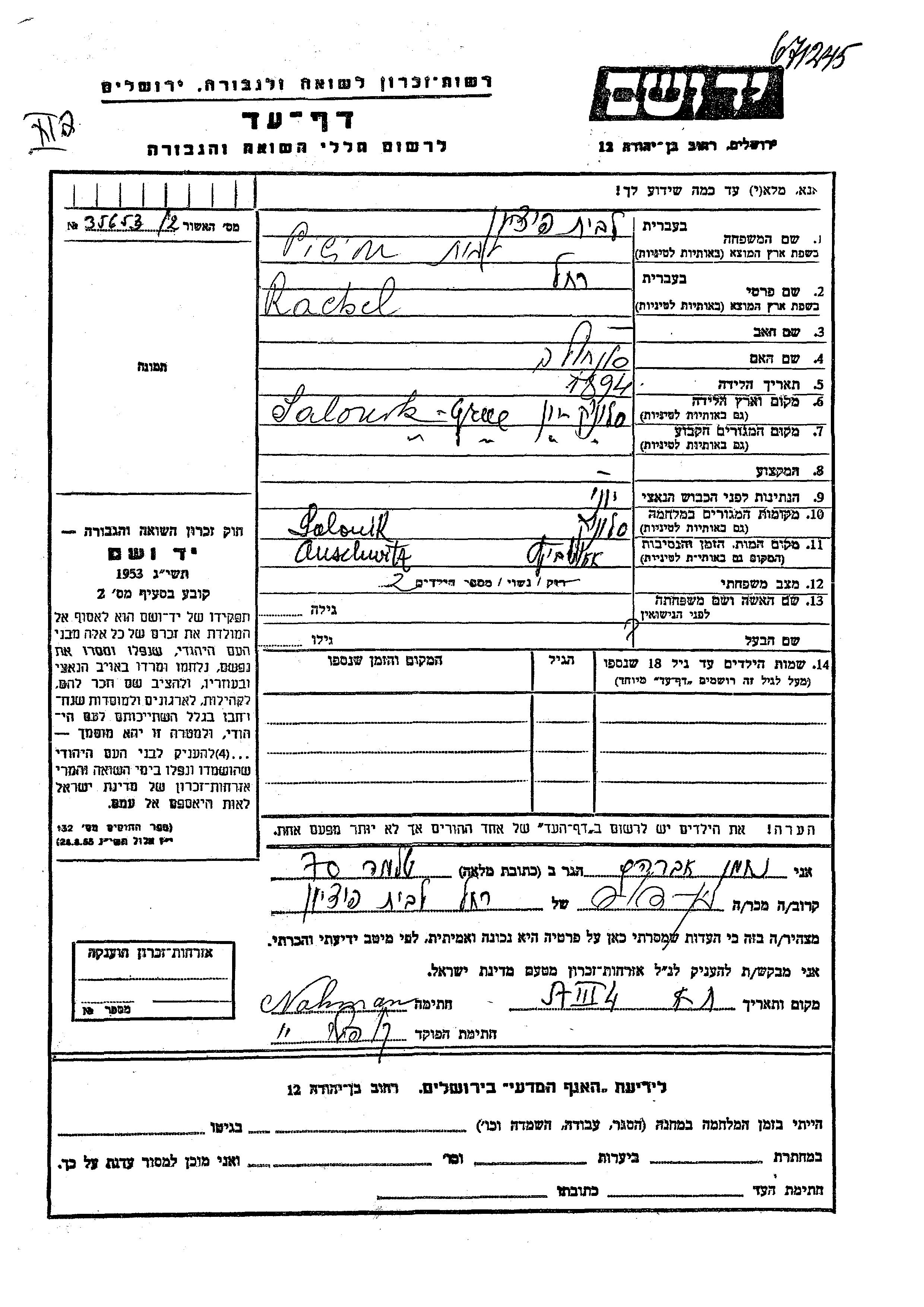 Yad Vashem - Pages of Testimony Names Memorial Collection