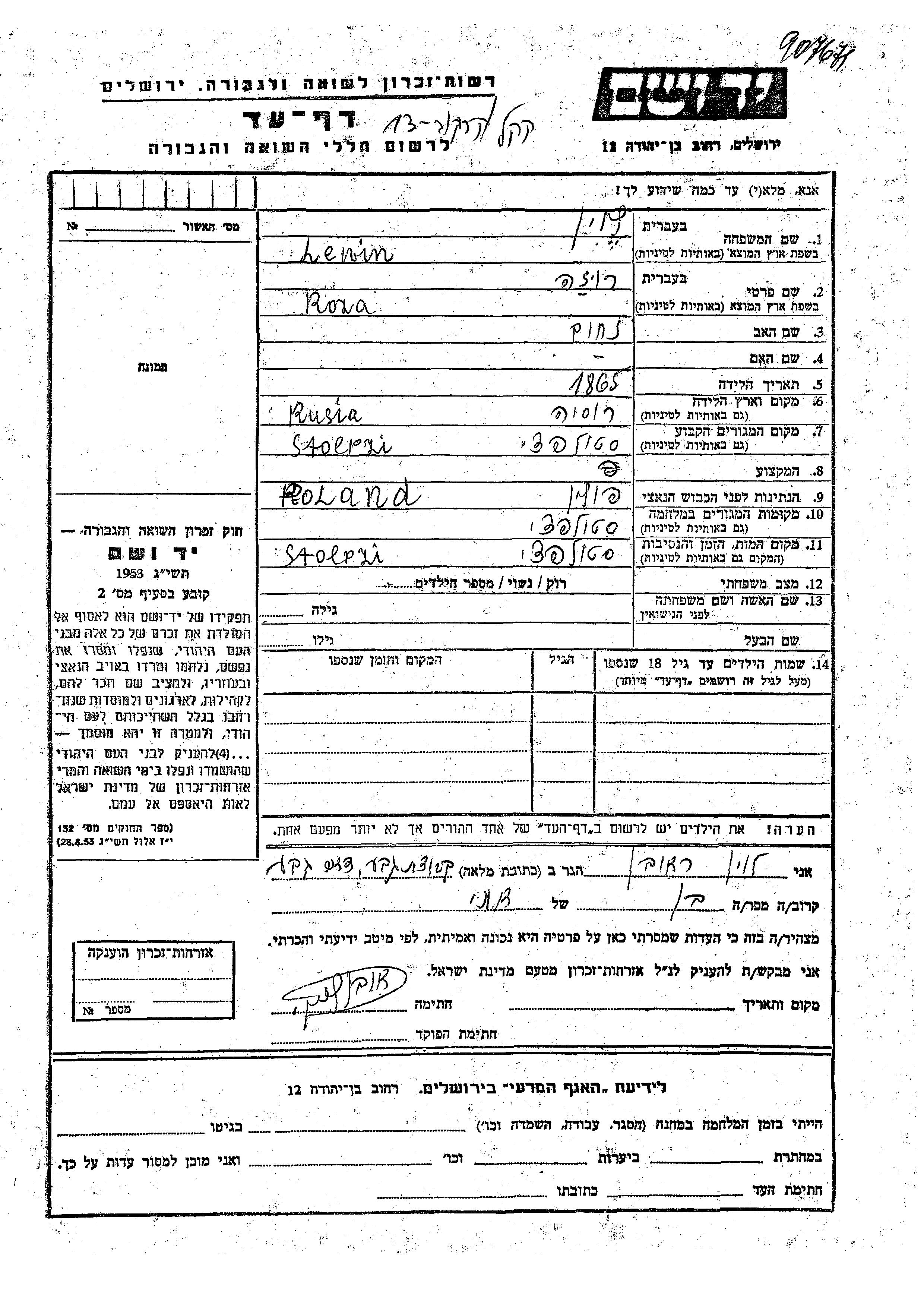 Lewin Roza 1865 Stolpcy, Pologne Feuille de témoignage