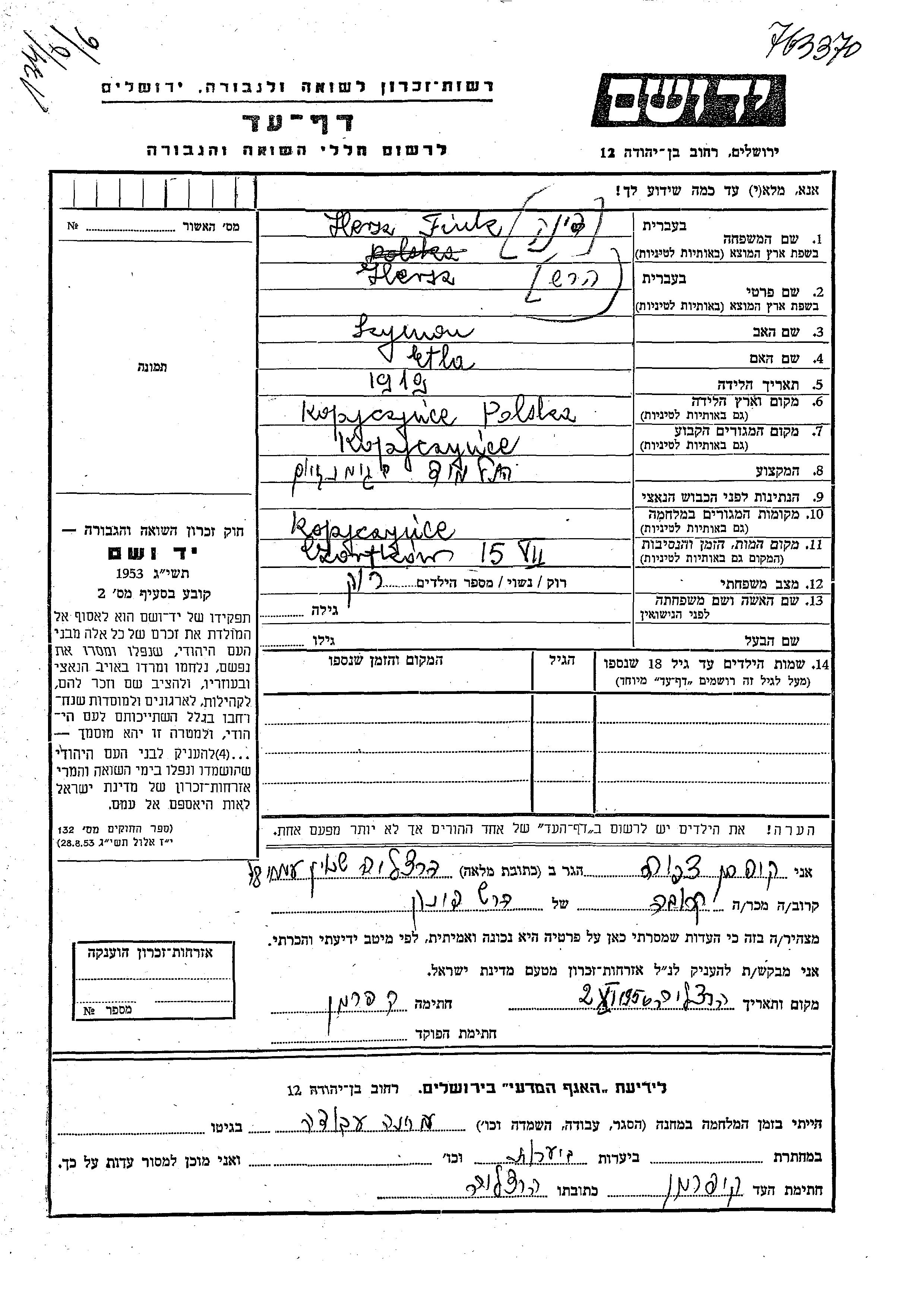 Fink Hersz 1919 Kopyczynce, Pologne Feuille de témoignage