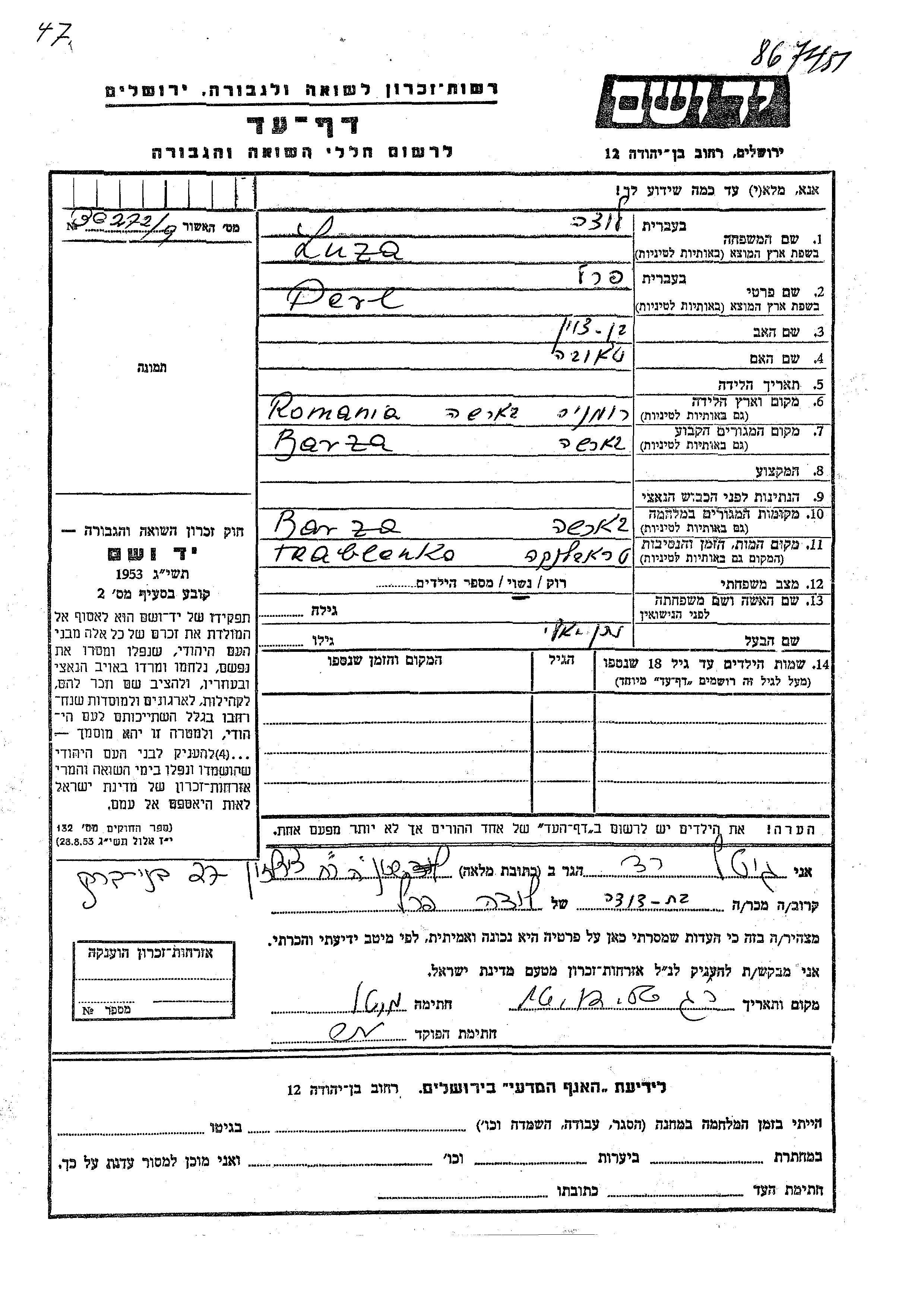 Luza Lutza Perl Barsa, Roumanie Feuille de témoignage